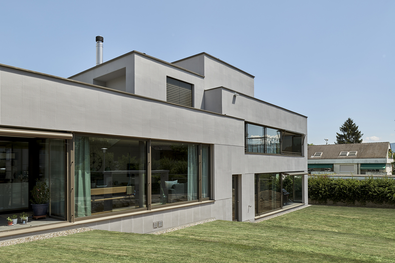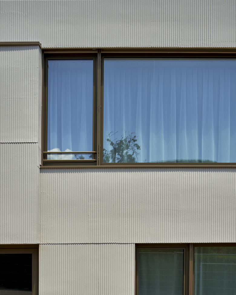 Die Fassade setzt sich aus diversen Flächen mit vertikaler Putzstruktur zusammen, welche das Volumen unterteilen und ein gewisses Spiel geben.