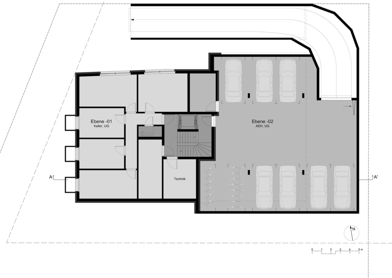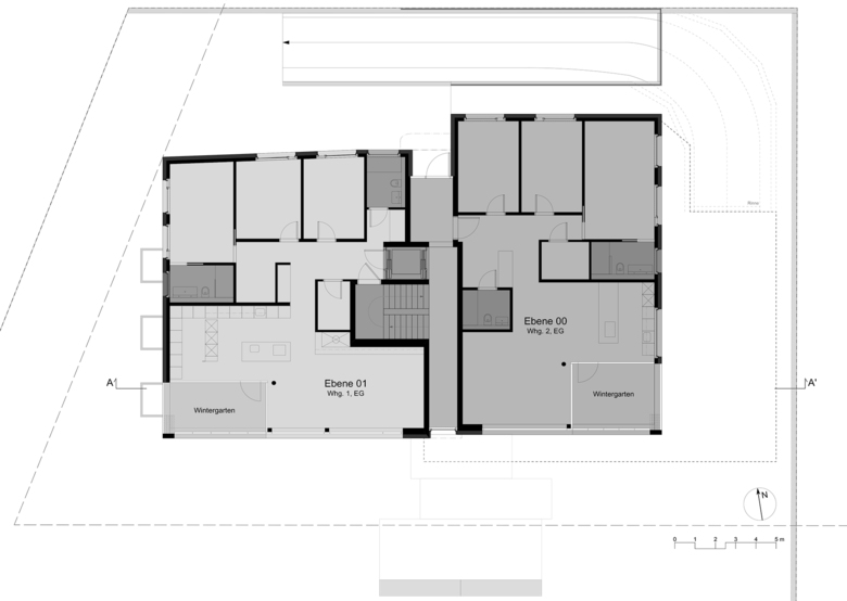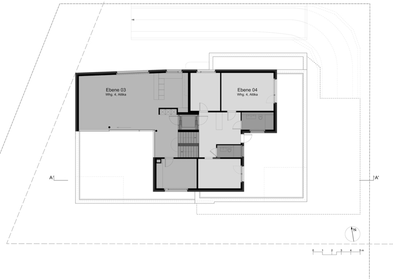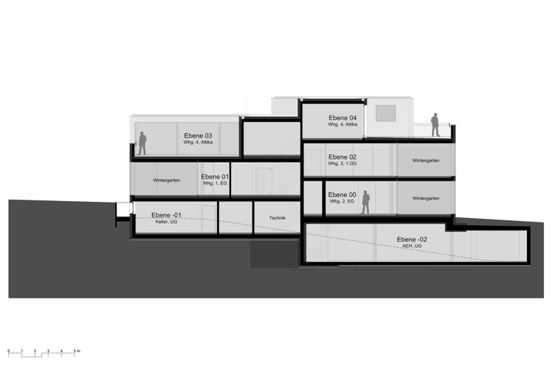 Charakteristisch für das projektierte Mehrfamilienhaus ist die Anordnung der Geschosse im Splittlevel. Dies bietet sich an, da das Grundstück eine Hanglage mit einem Niveauunterschied Ost-West von einem halben Geschoss aufweist. Im Westen treten ein Vollgeschoss und ein Attikageschoss, im Osten zwei Vollgeschosse und ein Attikageschoss zum Vorschein. Darunter befinden sich im Westen ein Kellergeschoss und im Osten eine Einstellhalle.