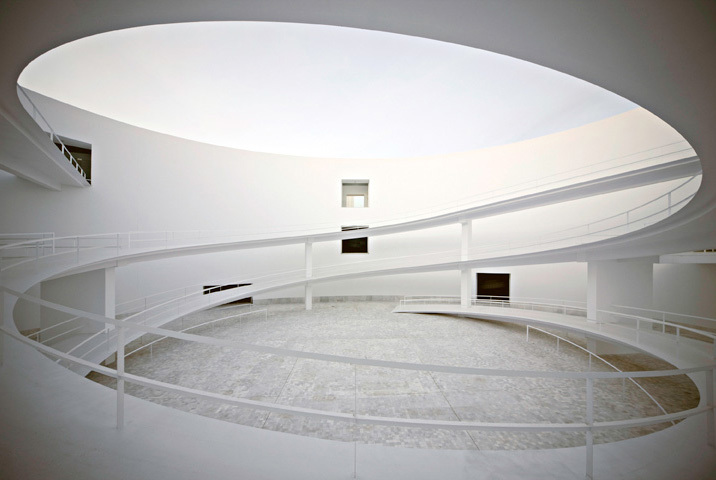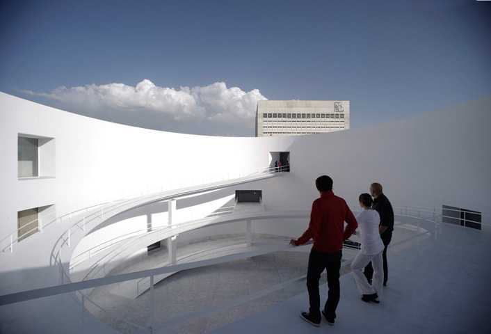 Our project for the MA is a building that continues the Central Headquarters of the CAJA GRANADA Savings Bank that we finished in 2001. We propose a podium-like structure measuring 60×120 m and rising three stories, so that its upper level coincides with the podium of the main CAJA GRANADA building. And its façade as well. Everything is arranged around a central courtyard, an elliptic form through which circular ramps rise, connecting the three levels and creating interesting spatial tensions. The dimensions of the elliptical courtyard have been borrowed from the courtyard of the Palace of Charles the V in the Alhambra.