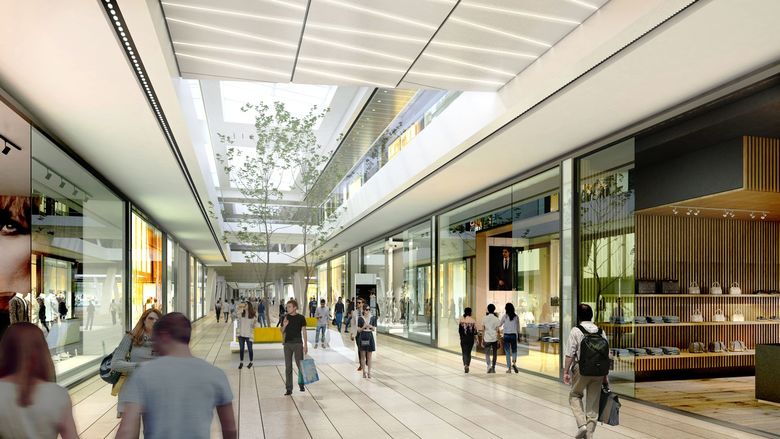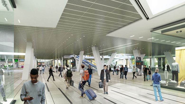 The interior is conceived as a continuous space in which the building's uses will blend seamlessly together. The two shopping levels are laid out along a linear gallery connected by three communication hubs, two at the east (open plaza) and west (railway plaza), and a spacious atrium at the center. The latter will connect the shopping mall to the train boarding area, a functional space that will house ticketing, passenger information, self-luggage lockers, cafeteria, VIP room, etc. leading up to the train platform. Accessible from the Rua Norte and offering views of the estuary, the roof is designed as a large landscaped public square, housing restaurants, entertainment venues and shows, as well as large skylights to provide natural lighting for the building.