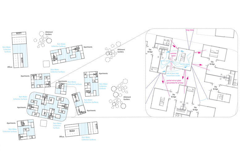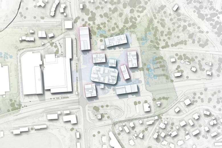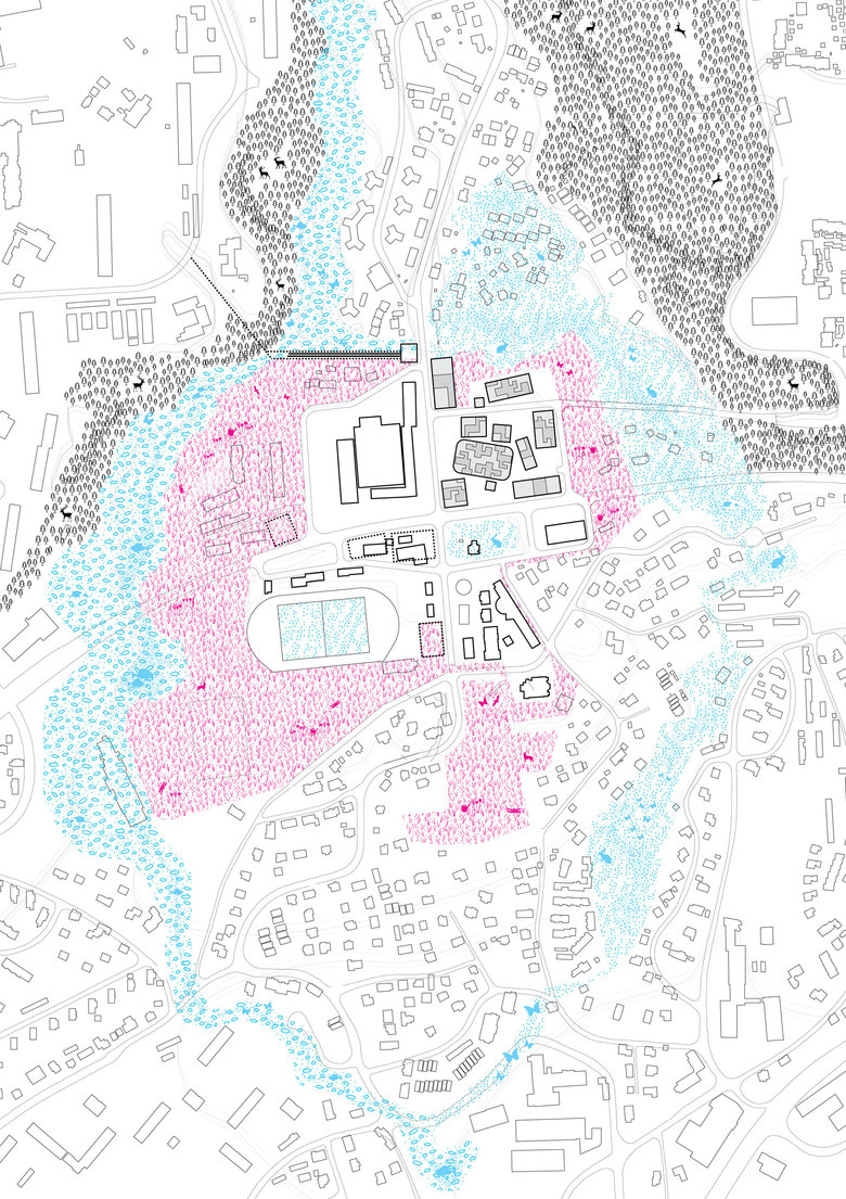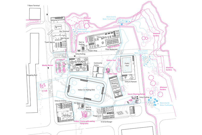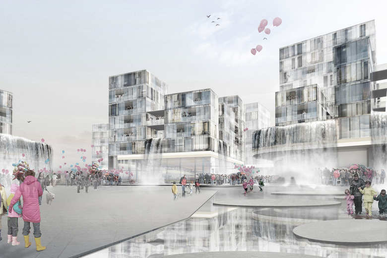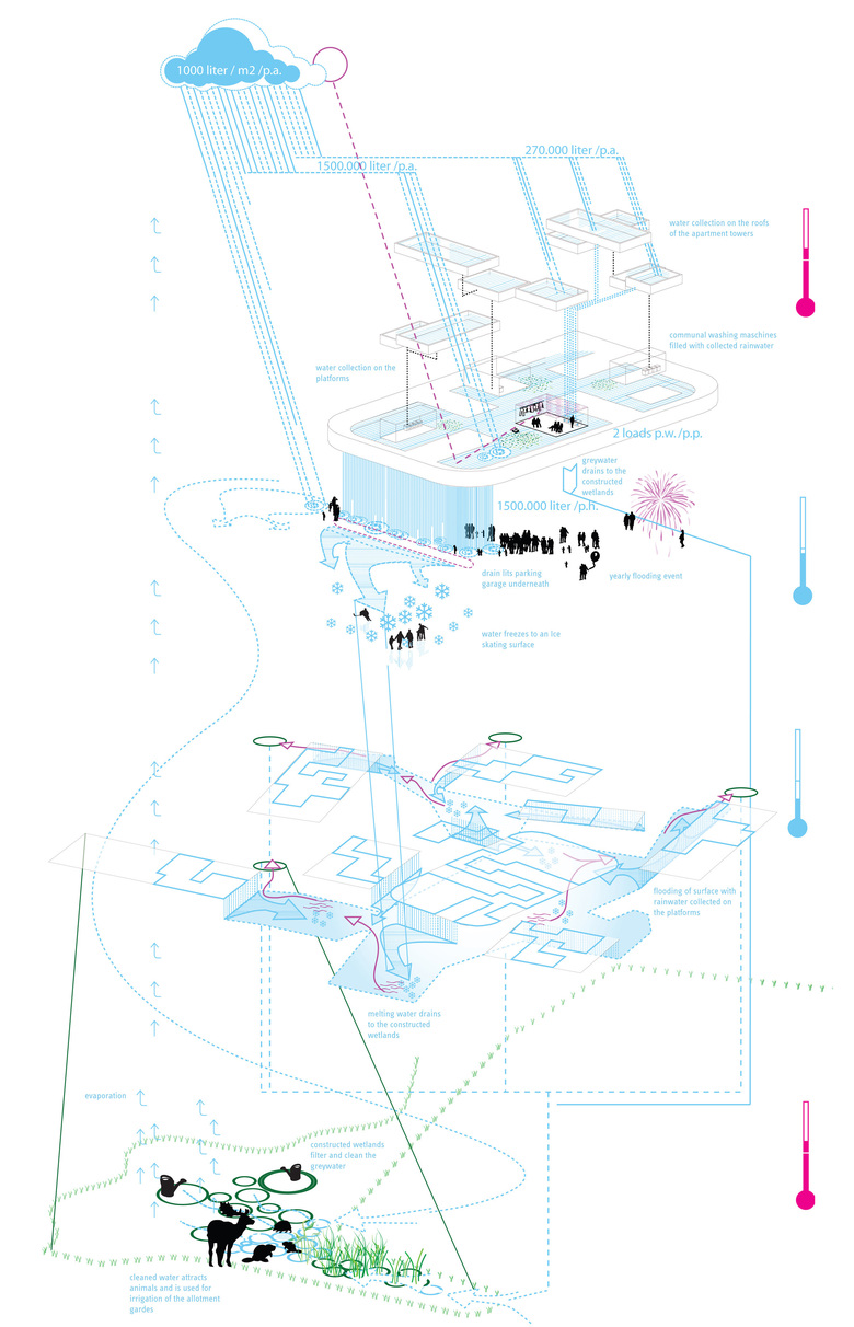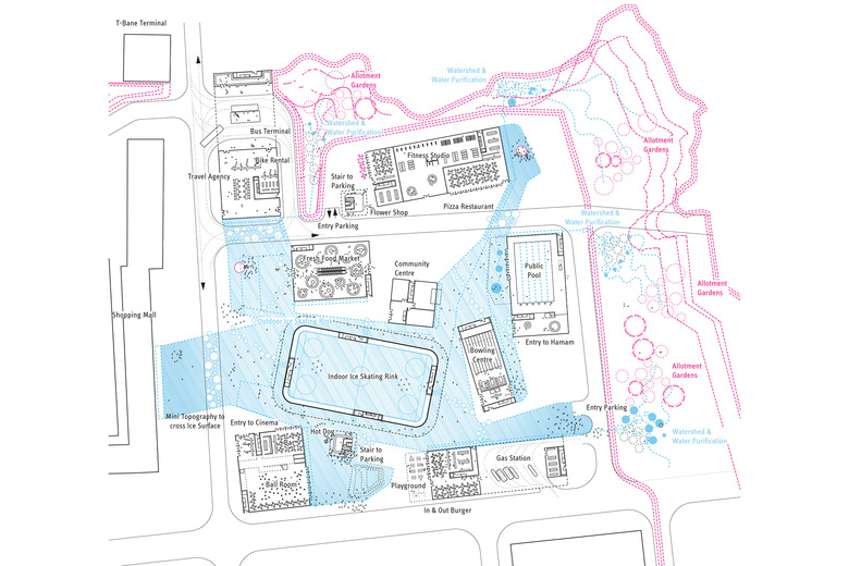 Cumulus is an urban strategy that conceptualizes public spaces as related to the environmental dynamics of northern living. The proposal focuses on a mixed-used development that (re)binds the different social spheres, programs, scales, and ecologies of the existing neighborhood. This manifests in a new urban center that is planned with an innovative rainwater management concept of seasonal expansion and contraction. The passage of water, in its different physical states and speeds, becomes the story of the neighborhood. As a new wintertime tradition, collected rainwater is released onto public spaces so that it can freeze into an open-air ice-skating surface. The “Day of the Waterfall” and the resulting dynamic public surface encourage interaction between existing and incoming communities, while putting the neglected area back onto Oslo’s map.