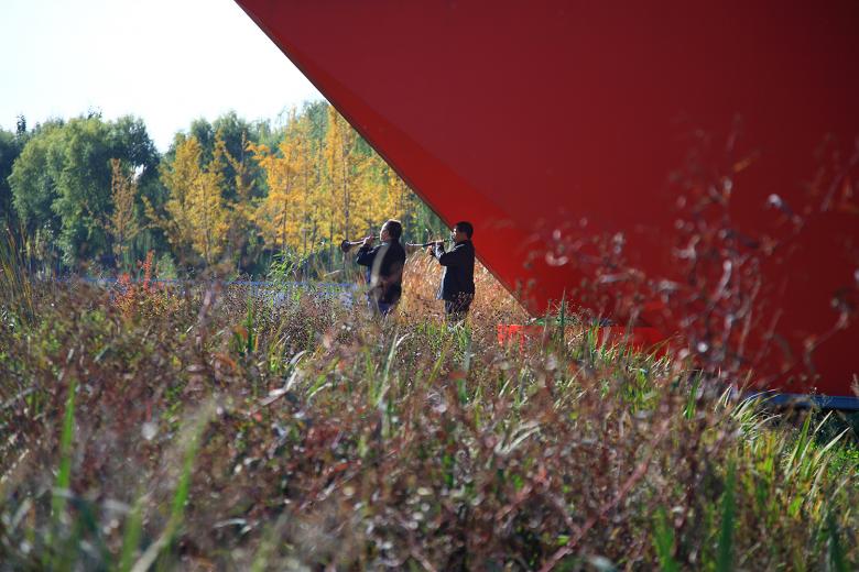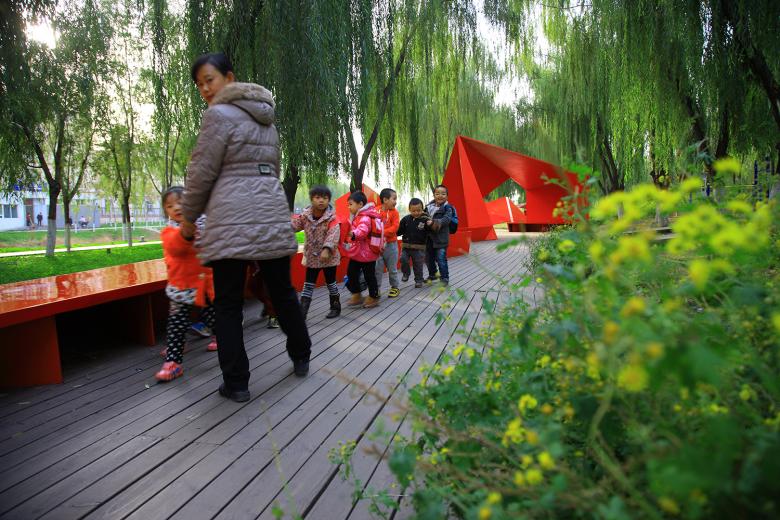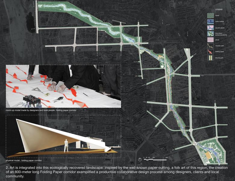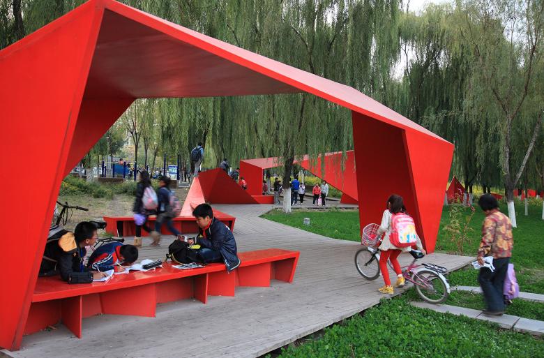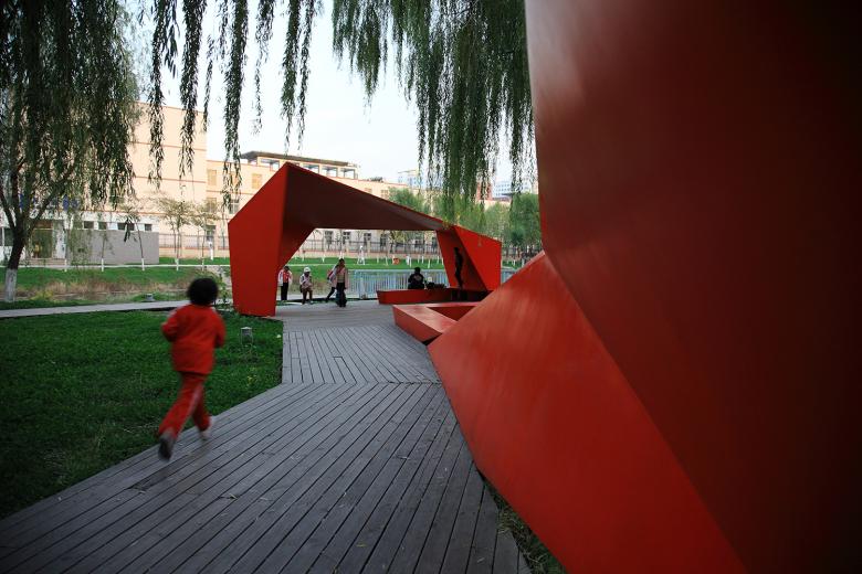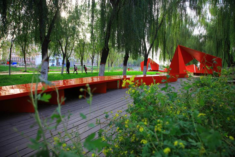 (7) Integration of art: Art is integrated with the ecologically recovered landscape. One of the major pieces is an 800-meter long Folding Paper made of fiber glass and in Chinese red, which integrates shelters, seats, boardwalk and lighting. The Folding Paper is inspired by the well-known local folk art of paper cutting. Sitting right on the school route between a densely populated community and city’s major elementary schools and kindergartens, this red-colored installation runs through the green canopy of the pre-existing willows, enriches the landscape with planting of “messy” Chinese pennisetum and wild chrysanthemum, and becomes an artful and unforgettable daily experience for kids and their parents.