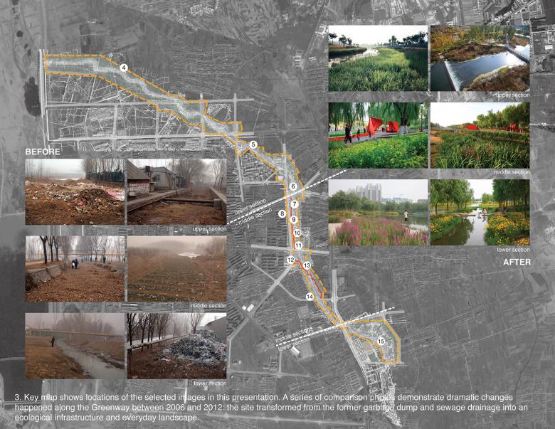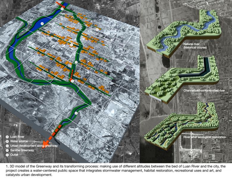The Qian'an Sanlihe Greenway is transformed from the former garbage dump and sewage drainage. It exemplifies how a neglected landscape can be recovered as an green infrastructure and everyday landscape with restored ecosystem providing multiple services. The combined pedestrian and cycle paths for both commuting and recreational use are integrated with art, revitalizing social identity by reflecting local traditions. Through the generation of ecological and aesthetic benefits, the project catalyzes sustainable urban development in the region.
