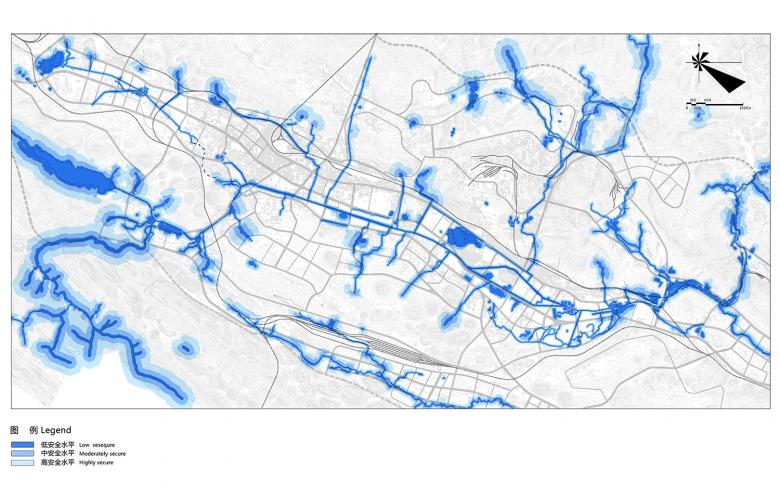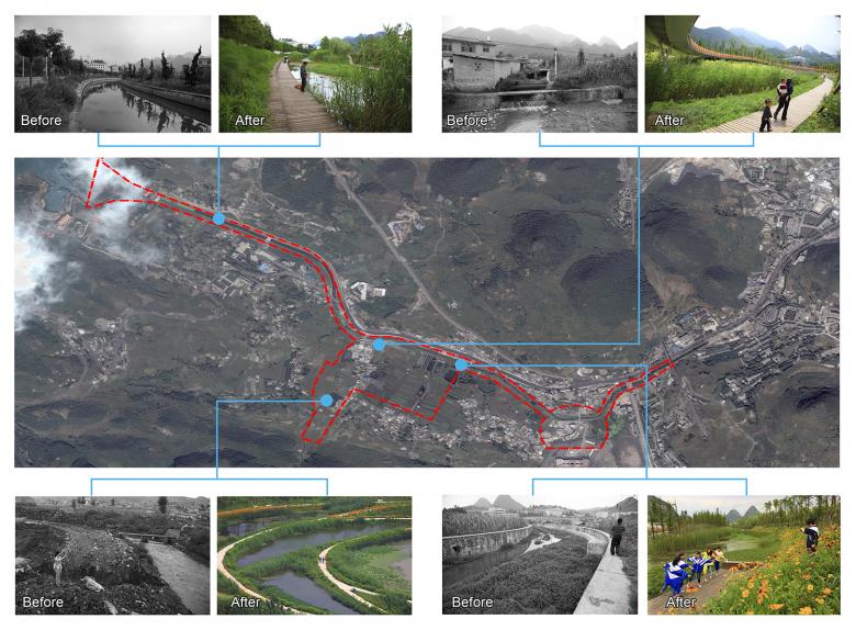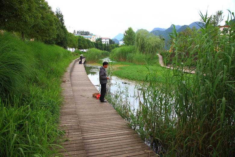 For the overall ecological infrastructure, the landscape architect focused both on the Shuicheng River drainage basin and the city. Firstly, existing streams, wetlands, and low-lying land are all integrated into a storm-water management and ecological purification system linked by the river, forming a series of water retention ponds and purification wetlands with different capacities. This approach not only minimizes urban flooding but also increases the base flow to sustain river water flow after the rainy season. Secondly, the concrete embankment of the channelized river was removed. A natural riverbank was restored to revitalize the riparian ecology and maximize the river’s self-purification capacity. Thirdly, continuous public spaces were created to contain pedestrian and bicycle paths increasing access to the riverfront. These corridors integrate the urban recreation and ecological spaces. Lastly, the project combines waterfront development and river restoration. The ecological infrastructure catalyzes urban renewal efforts in Liupanshui, significantly increases land values, and enhances urban vitality.