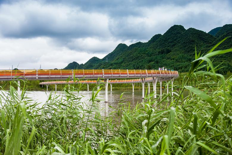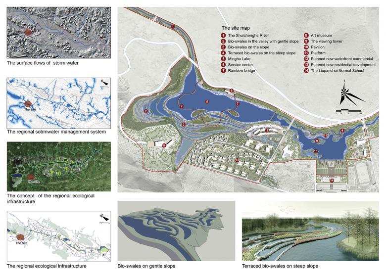 The submitted Liupanshui Minghu Wetland Park project, 90 hectares (222 acres) in size, is the first phase and a major part of the comprehensive ecological infrastructure project planned for the city by the landscape architect.