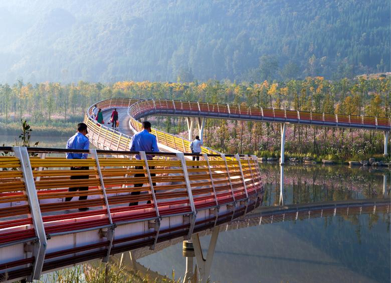 (3) Pedestrian paths and bicycle routes are overlaid on the green spaces along the waterways and form a circuit around and between the wetland terraces. Resting platforms with abundant seats, pavilions and a viewing tower are integrated into the designed natural system for universal access. This fosters learning, recreational and aesthetic landscape experiences. An environmental interpretation system was designed to help visitors understand the natural and cultural meaning of the places. Clearly, the most iconic built artifact is a warm-colored rainbow bridge, in contrast with the frequently cool and damp climate. This causeway connects three sides of the central wetland (lake), creating unforgettable walking and gathering places. These have quickly become favored social and recreational environments of the citizens and attract visitors from near and far.