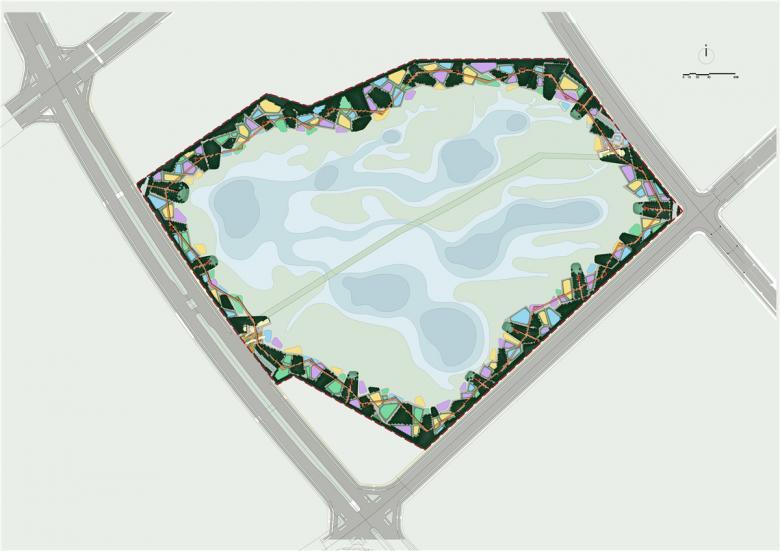(2) Cut-and-fill strategy to create an outer ring of mounds and ponds. The cut-and-fill around the perimeter is a minimum earthwork strategy to transform the site. Earth is excavated and used to build up a necklace of ponds and mounds around the perimeter of the park. This ring acts as a stormwater filtrating and cleansing buffer zone for the core wetland, and a transition between nature and city. Stormwater from the newly built urban area is collected around the perimeter of the wetland and then released evenly into the wetland after having being filtered through the ponds. Native wetland grasses and meadows are grown on ponds of various depths, and natural processes are initiated. Groves of native silver Birch trees (Betula pendula) grow on mounds of various heights and create a dense woodland. A network of paths links the ring of ponds and mounds, allowing visitors to have a walking-through-forest experience. Platforms and seats are put near the ponds to enable people to have close contact with nature.