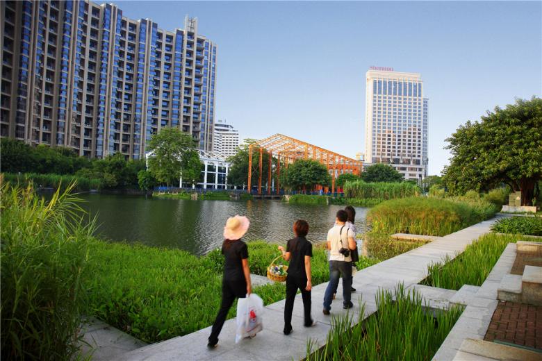 The park merges into the urban fabric through a network of paths and urban facilities that were extended into the park, such as docks that are reused for tea houses (local people customarily drink tea in tea houses). Water elements merge via the inlet from the sea that fluctuates along with ocean tides.