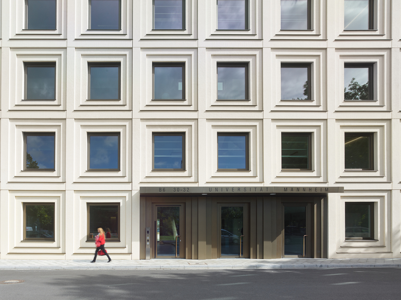 Der Neubau des Forschungs- und Lehrgebäudes befindet sich auf dem Stadtquadrat B6, über den Resten der historischen Stadtmauer. Das Raumprogramm umfasst flexibel nutzbare Seminar- und Bürobereiche, studentische Arbeitsplätze sowie großzügige Kommunikationsbereiche.
