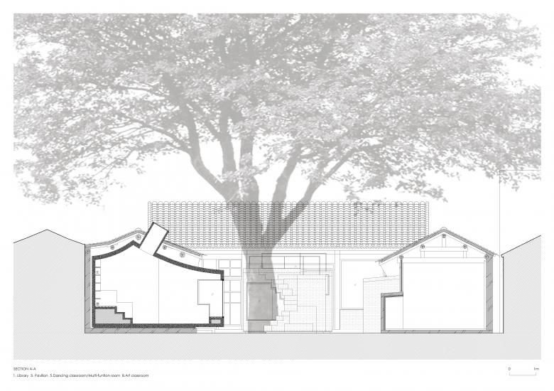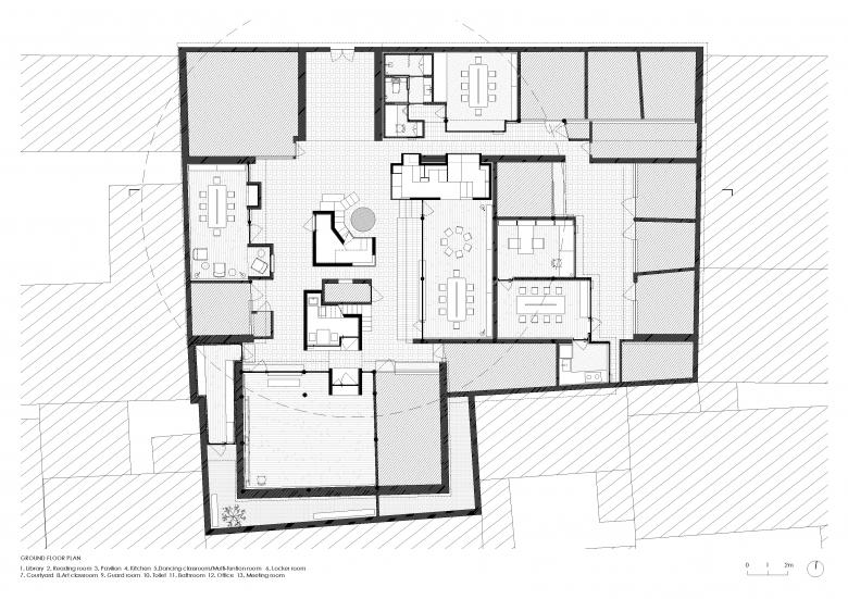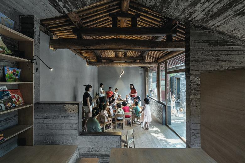 The architects made conceptual use of the structural layer as inspiration for redefining the spatial characteristics of an historical epoch. The fragmentary collage of materials was removed along with components that were no longer needed. In their place, the new extensions and installations set new aesthetic standards with just a few materials like concrete, grey brick, and natural wood frames for the doors and windows, thus calling to mind the old courtyard houses, but nevertheless without erasing the informal history. As a children’s library and meeting point for the neighbourhood, the centre brings a new public realm into the hitherto exclusively private courtyard. Some of the old residents have remained in their units, which means that public and private uses exist next to one another.