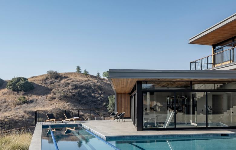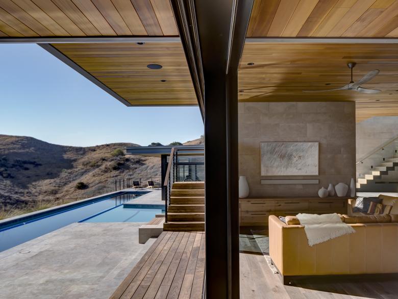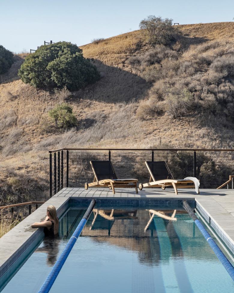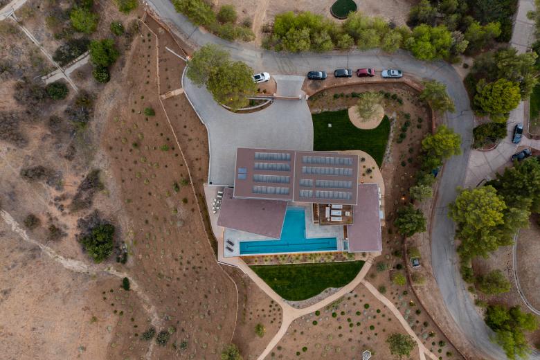 The pool terrace and adjacent open-air living room unfold onto the meadow and ultimately the arroyo below, augmenting a natural, preexisting path for animals with a minimally delineated walking loop with which to explore the site. The sensitive nature of the fire susceptible landscape, as well as the unique climate, solar, and seasonal conditions called for careful positioning of the home, as well as consideration of plant specifications and irrigation requirements.