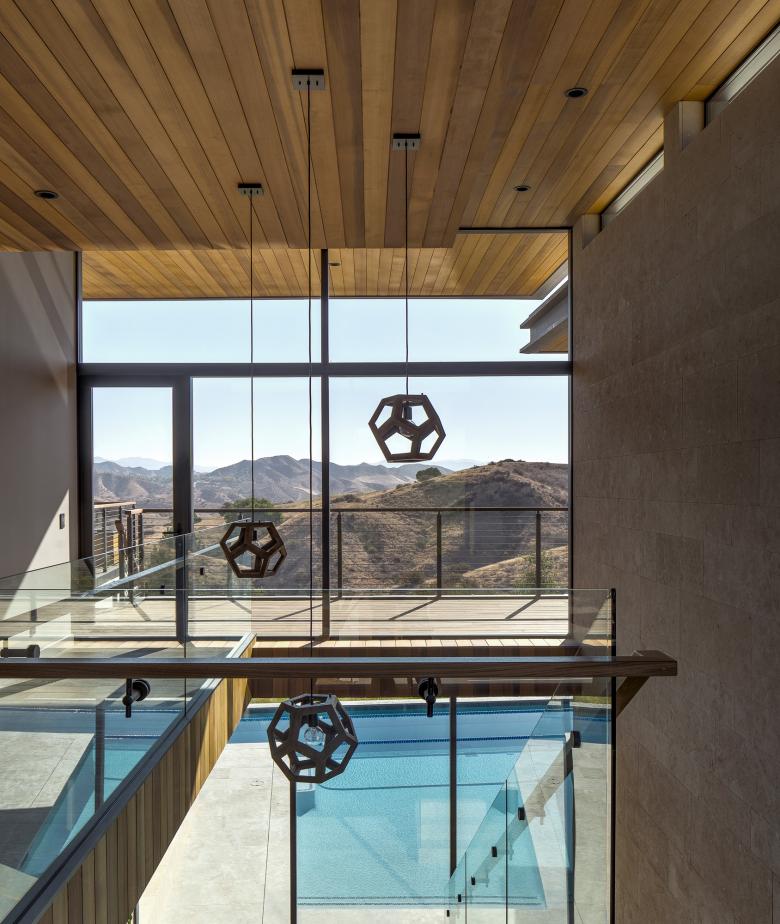 The lower level, containing a home gym, laundry room, guest suite, and pool terrace, extends into the hillside providing an unobstructed panoramic vista. The continuous materiality of cedar and limestone accentuates the experiential relationship between inside and out. This connection to the outdoors continues