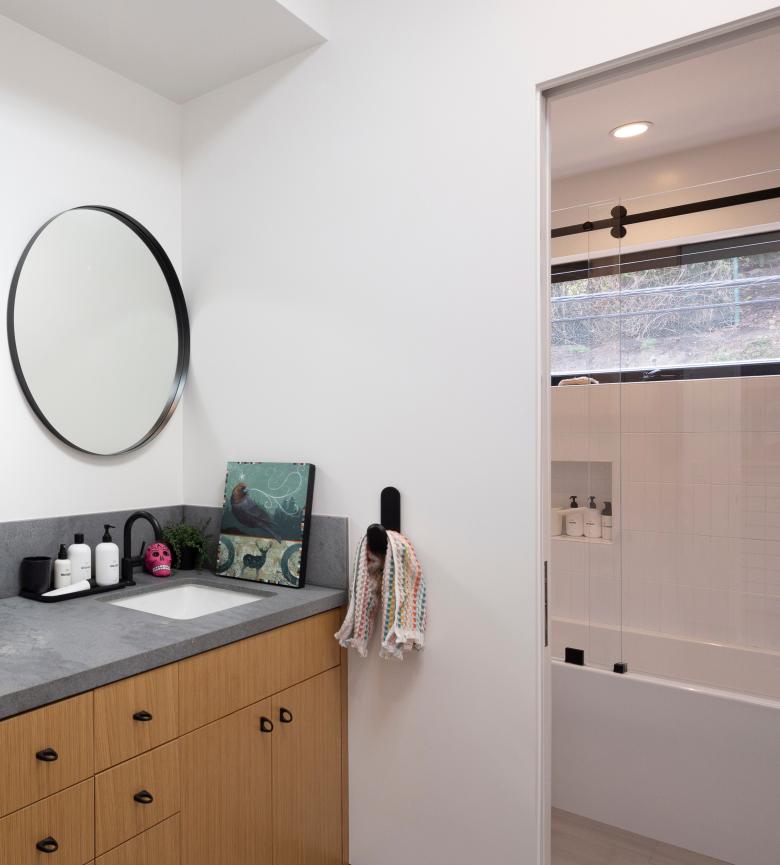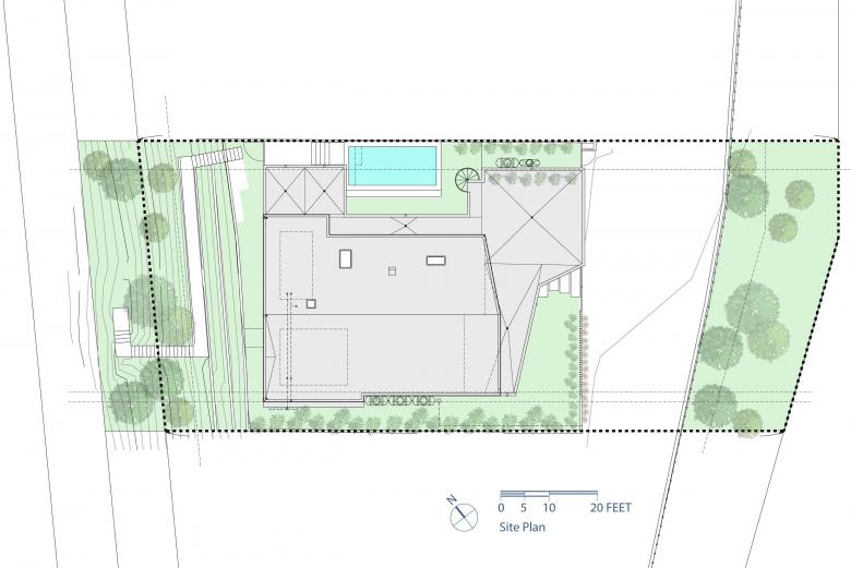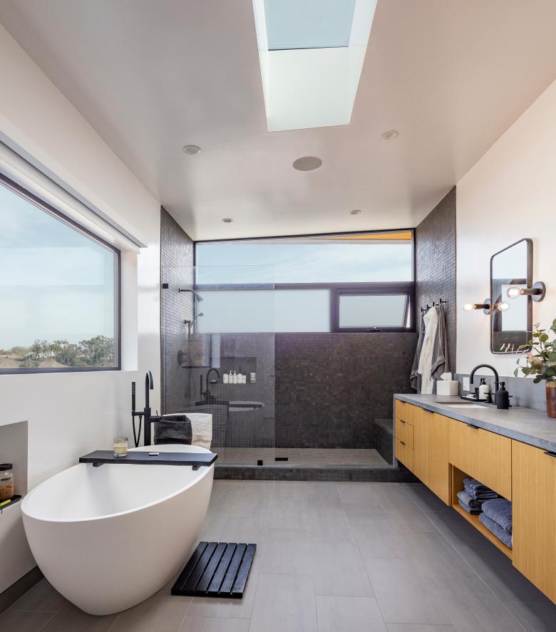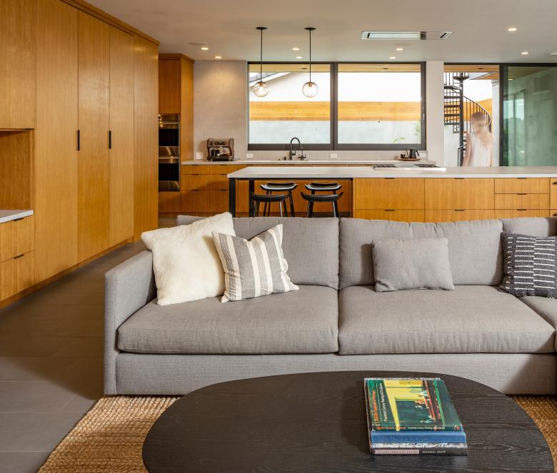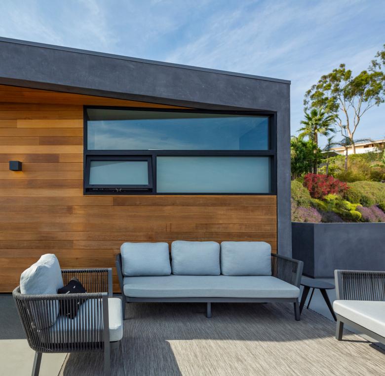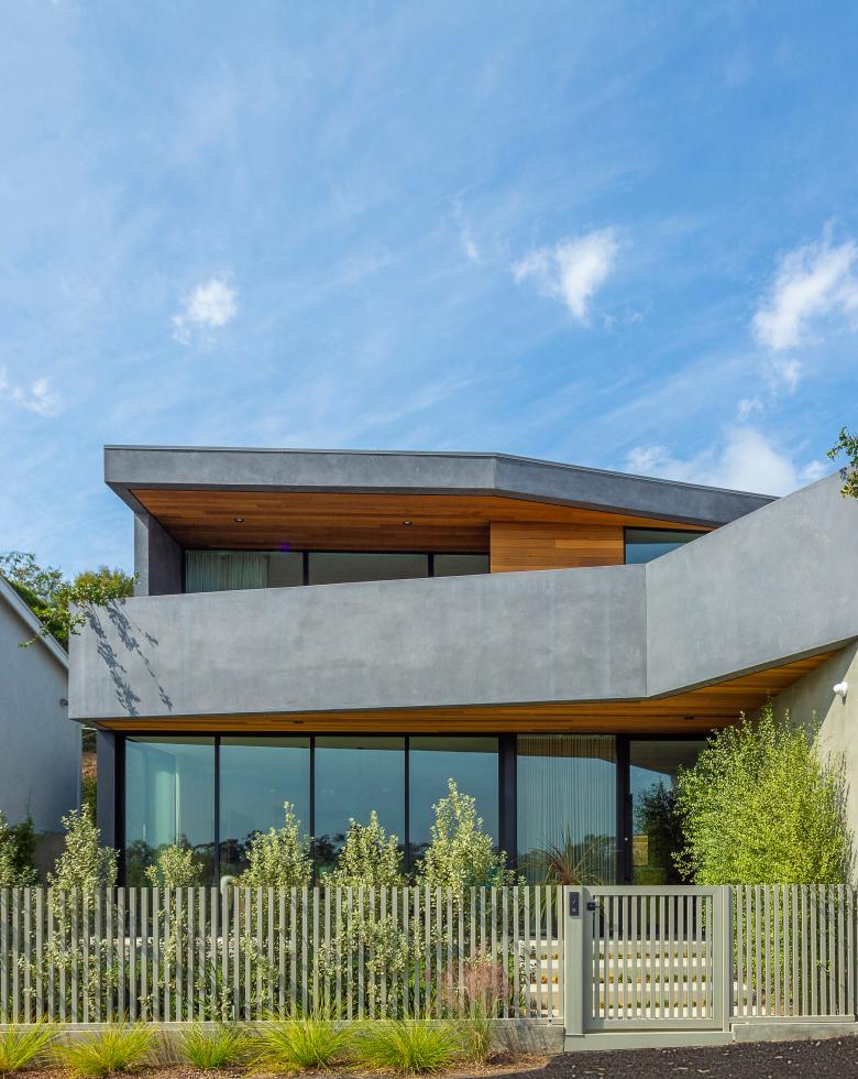 Completed in 2021, this 3,000 square foot residence, sited on a private coastal California hillside street, optimizes its compact footprint in order to encourage outdoor living. A façade of smooth plaster and cedar siding bundle the interior rooms with strategically placed exterior spaces, producing long sightlines throughout the interior.