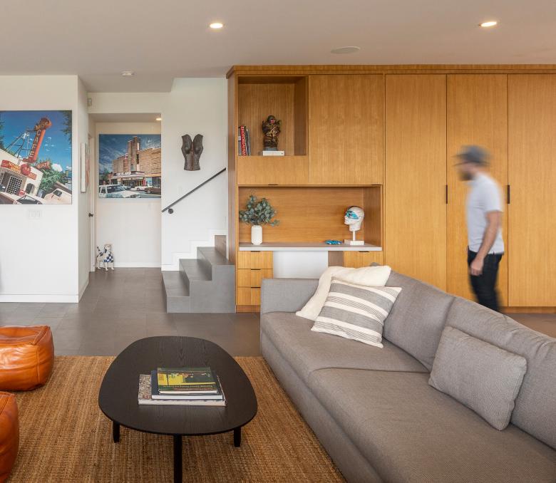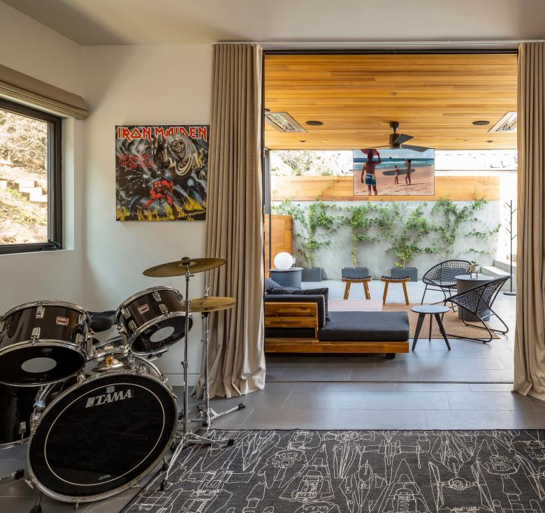 The informal configuration of the home supports the family’s love of music and art, generating numerous opportunities to display their art collection and to engage in impromptu recitals.