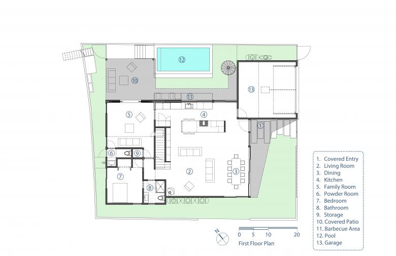 On the ground floor, an open living space forms the center of the home, bracketed by two courtyards that provide direct access to the outdoors, generous natural light, and views of the surrounding coastal landscapes. Telescoping doors and windows extend the living room, dining room, and kitchen seamlessly out to the entry garden and the interior pool terrace. Additionally, guest quarters opening to the rear landscape, and a music studio connecting to a covered terrace, are positioned adjacent to the primary living areas.