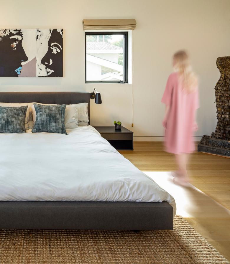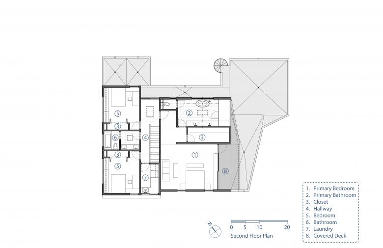 Three bedrooms are located on the second floor, separated from one another by the staircase hall, creating a private retreat for every member of the family. The primary bedroom, coupled with an en-suite bath, walk-in closet, and a wrap-around deck, captures views of the Pacific Ocean in the distance. Two additional bedrooms share a second full bath and an exterior deck overlooking the pool. The connection of the second-floor decks with the pool terrace via a circular staircase creates a circuit of exterior living to fully engage the coastal climate.