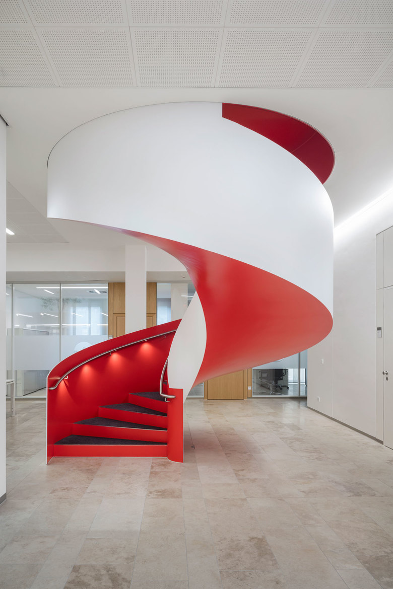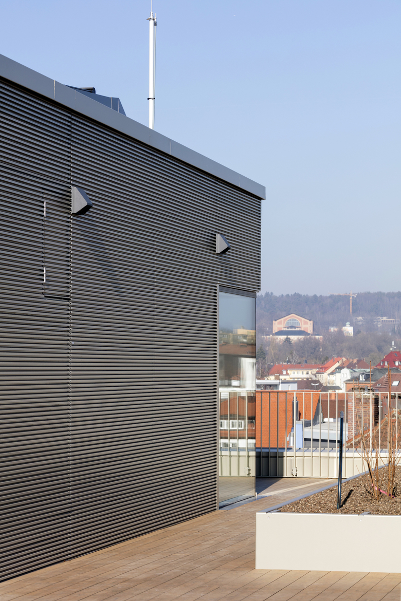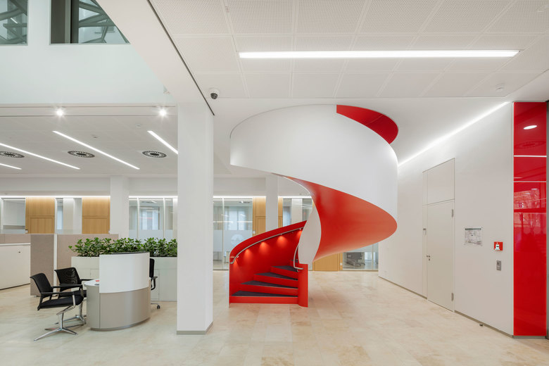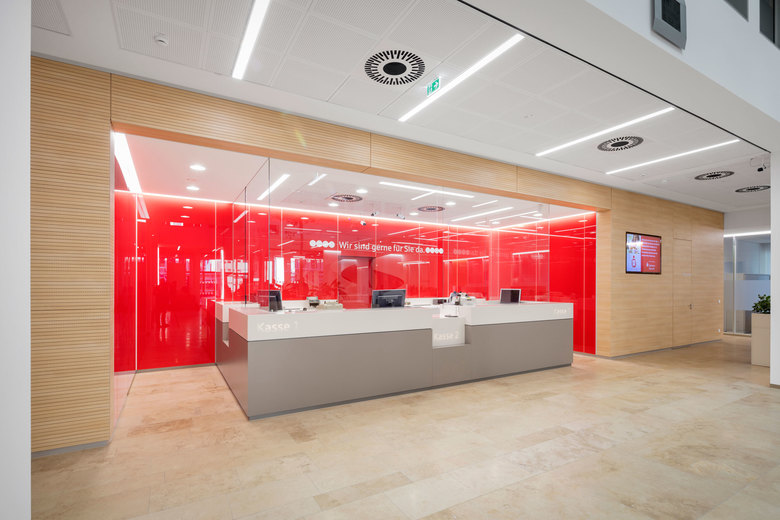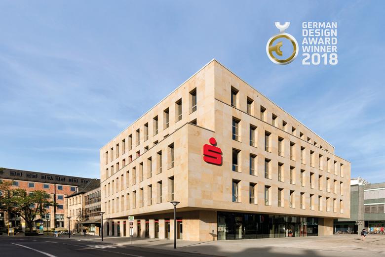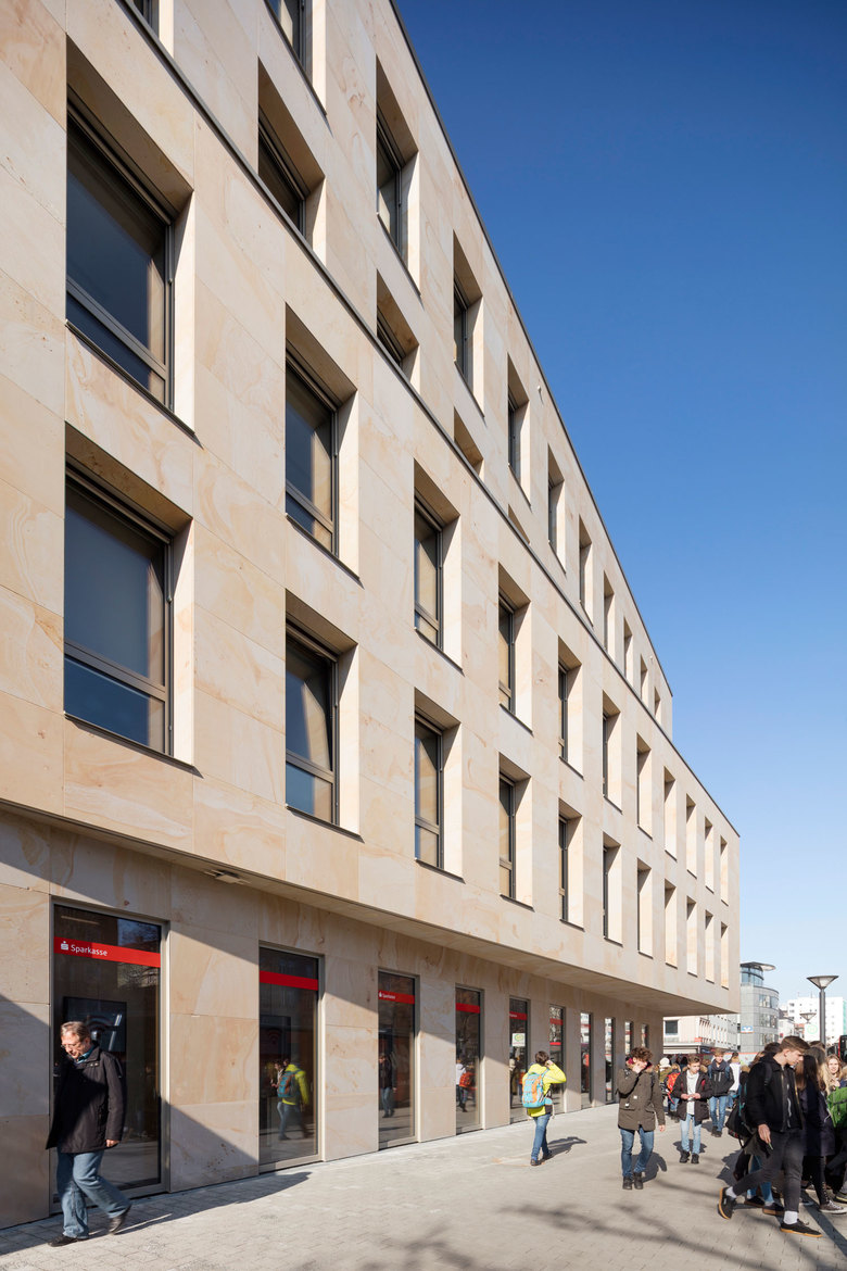 Der Ersatzneubau des Kundenhauses liegt am Rande der Innenstadt, auf der Südseite des Luitpoldplatzes, der besonders vom Hochhaus des um 1970 erbauten Neuen Rathauses geprägt wird. Leitgedanke ist die sensible Einfügung in die städtische Umgebung, wobei das Haus aber auch durch selbstbewusstes Auftreten als Bau unserer Zeit erkennbar sein soll. Das zweite bis vierte Obergeschoss des fünfgeschossigen Kubus mit Patio wird leicht aus der Flucht gedreht und nimmt Bezugslinien und -höhen der Umgebung auf. Das durch eine monolithisch wirkende Sandsteinverkleidung geprägte Äußere bezieht sich besonders auf die Stadt und deren von Noblesse und Zurückhaltung geprägte Baukultur. Die regelmäßig durchfensterte Fassade mit stehenden Formaten wirkt zeitlos elegant und zugleich wird die zukünftige Funktion als Bankgebäude durch die klar und rational durchgebildete Fassade nach außen abgebildet. Ein angemessen großzügiger Patio belichtet das Herzstück des neuen Hauses, die großzügige Kundenhalle. Der funktional-ökonomische Grundriss der Obergeschosse mit seinen durch Drehungen begründeten Aufweitungen ermöglicht flexible Raumzuschnitte, wobei eine Büroorganisation in Zellenstruktur vorgesehen ist. Das Gebäude ist als konventioneller Stahlbetonbau aus Stütze und Platte konzipiert, der über Stahlbetonkerne ausgesteift wird. Die Ausbildung der hinterlüfteten Sandsteinfassade mit mineralischer Wärmedämmung folgt dem Gedanken der Nachhaltigkeit.