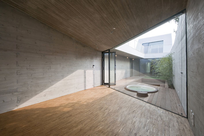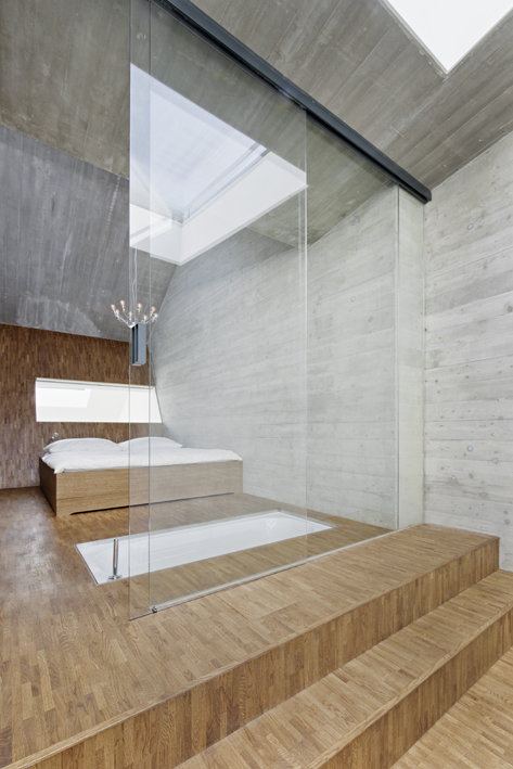 Der äussere White Cube setzt sich als innerer White Cube beim Atelier / Garage und dem Kino im Keller fort. Beim dahinterliegenden Wohn- Bürobereich verbinden durchgehende Sichtbetonoberflächen mit Brettschalungsoptik an den Wänden und der Decke sowie durchgehende Holzbodenbeläge in gleicher Ausrichtung wie die Brettschalunsgoptik der Wände den Innenraum und den Aussenraum zu einem Raumkontinuum. Dieses schiebt sich über die zentralen Küchenpodeste als Teil der Stiegenlandschaft ( cj_5 = Cooking-Jokey- 5m breit) über das Atelier zum Schlafbereich im Obergeschoss. Die seitlich angeschlossenen Räume Bad und WC sind dann jeweils als eigenständige Farbinseln mit kleinstformatigen Fliesen ausgebildet. Von allen Wohn- und Bürobereichen bestehen durch das „Raum in Raum System“ Sichtverbindungen untereinander und zum zentralen Aussenraum, dem Gartenatrium.