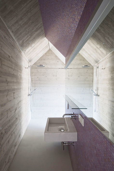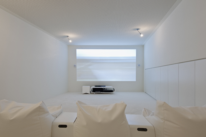 Von aussen betritt man eine relativ geschlossene weisse Raumskulptur, die sich dann über den Vorbereich Atelier / Garage zum Wohnbereich und Atriumsgarten immer weiter nach oben öffnet und so trotz der Enge des Grundstückes innen sehr grosszügige, ineinander verwobene Räume entwickelt.