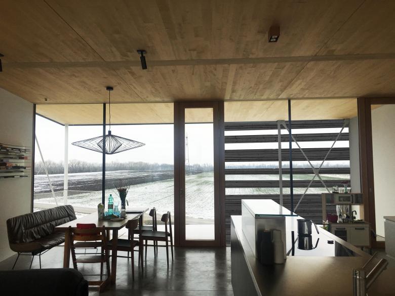 Die Situierung des Wohnraumes mit offener Küche am „Gipfel“ ermöglicht nordwestseitig weite Fernsicht über die Ebene mit langläufigen Pferdekoppeln, Äckern und Sträuchern.