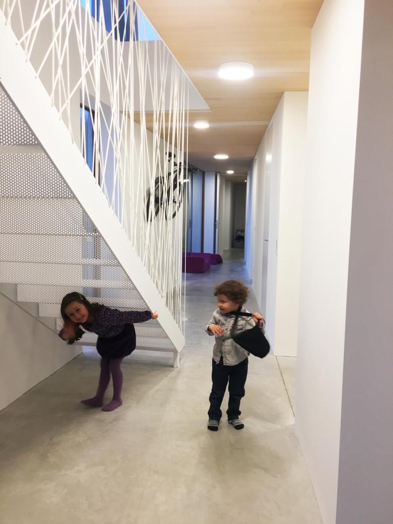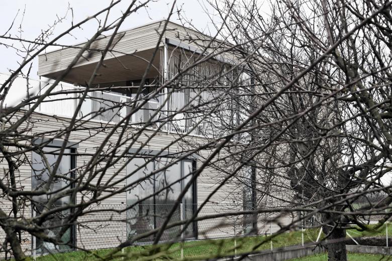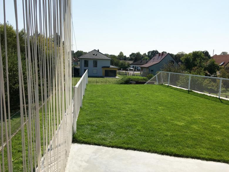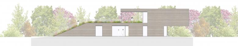 Südostseitig, auf der Hangseite, öffnet sich der Raum maximal zum begrünten Außenraum und lässt ihn mit dem Innenraum verschmelzen. Die Terrasse geht fließend über in eine Liegewiese, geht über in den Hang zum Rodeln und Runterkugeln. Auch das Dach über dem „Gipfel“ ist als Gründach ausgeführt