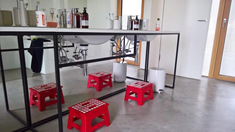 Der Böden innen wie auf den Terrassen bestehen aus geschliffenen im Innenraum beheizten und gewachsten Betonplatten.