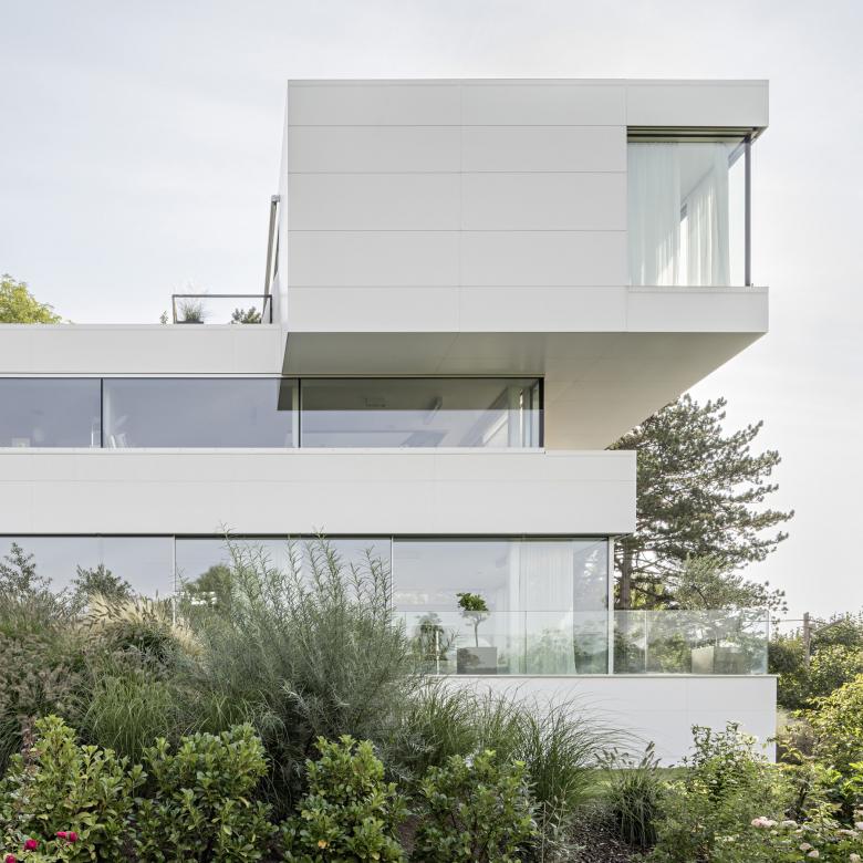 In order to be able to create as many usable outdoor areas as possible that are not visible from the street, the desired spatial program was stacked up and the street-side facade closed except for a narrow slit under the ceiling above the ground floor. The basement is interpreted as a base, with generous glazing on the ground floor as a joint and a "floating" cuboid as the attic. The challenges lay in particular in translating the abstract nature of the stacked volumes of the preliminary design into implementation details.