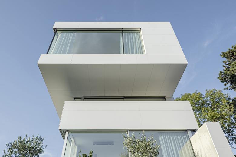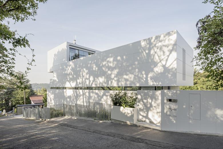 The snow-white Corian facade contrasts with the surrounding allotment houses, some of which are cheerfully colorful, in a winking manner. At the same time, the smooth, white acrylic stone acts as a projection surface for the shadow play of the surrounding trees.