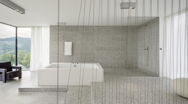The client's wish for high-quality materials was met discreetly and unpretentiously. Cast and polished Danube pebble terrazzo on the first floor and in the bathroom, white Corian on the facade, real wood oak planks and an opening glass facade make House Rock a real luxury piece.