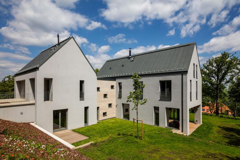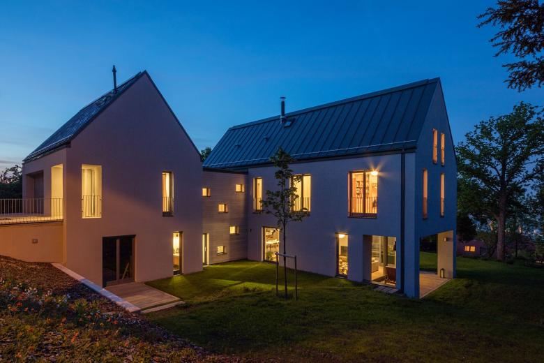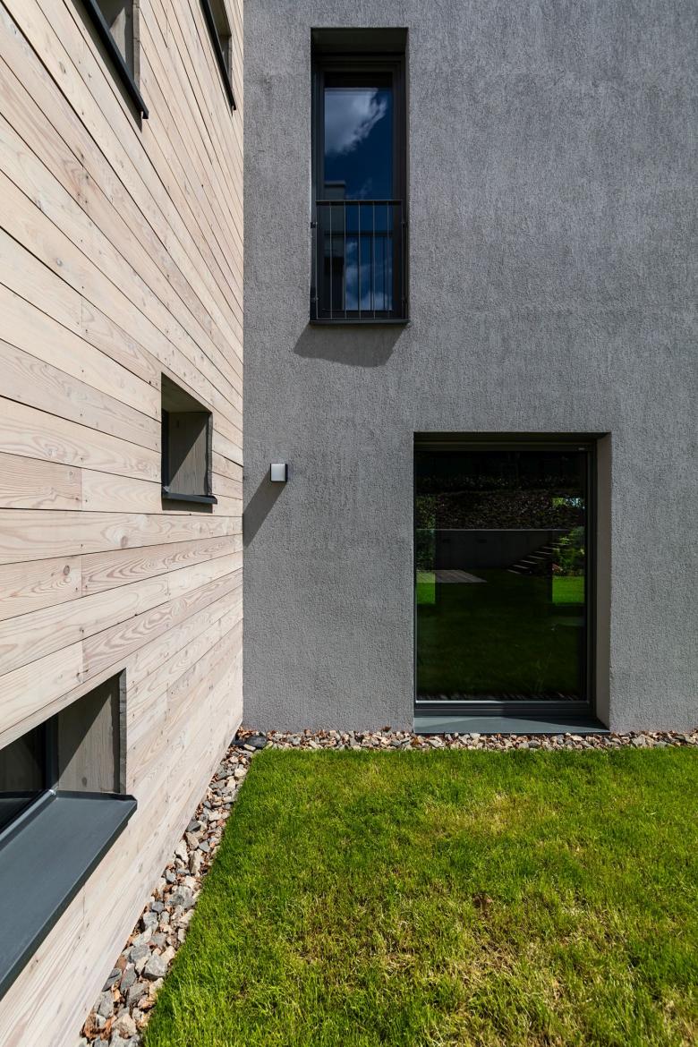 The connecting element’s facade is differing from the two blocks. The composition of the windows are intended to be playful and the wooden cladding - which ages nicely with time - forms contrast with the tight, saddle roof blocks.