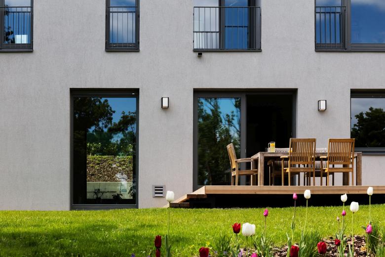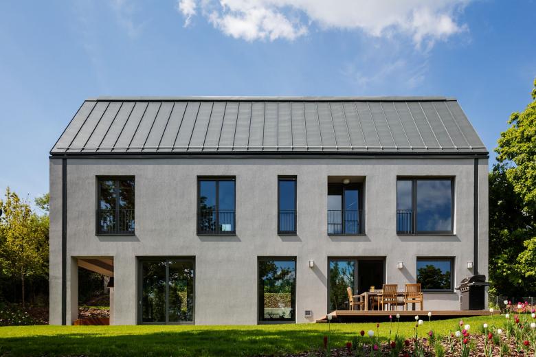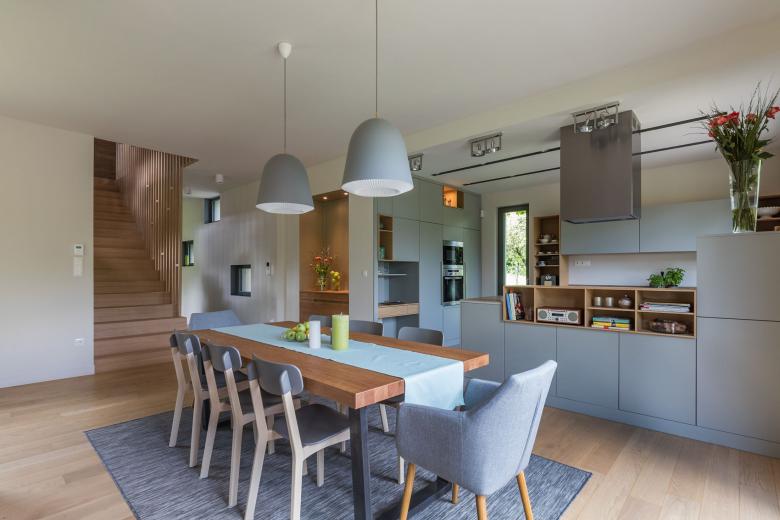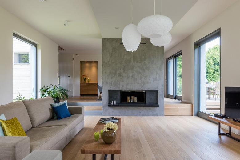 The cold, greyish tones harmonize with warm colours, both inside and outside.