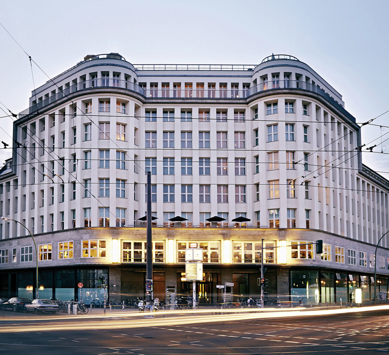 Die alte charakteristisch geschwungene cremefarbene Fassade mit Risaliten wurde wiederhergestellt. Neue Holzverbundfenster - nach Recherchen der alten Bestandszeichunungen aus den Archiven - wurden von einer in Berlin ansässigen Firma hergestellt und gewährleisten die erhöhten Anforderungen an den Schall- und Sonnenschutz. Gleichzeitig wurden die Fenster der Hoffassade durch Holzfenster ersetzt und der Außenputz, alte Crackelen und der Naturstein einer großflächigen Sanierung gemäß historischem Erscheinungsbild unterzogen. Die im Erdgeschoss neu hergestellte Pfosten-Riegel-Fassade nimmt die ursprünglichen Fassadenteilungen und Profilstärken auf.