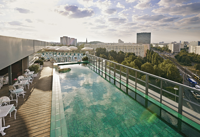 Alle notwendigen Abdichtungsarbeiten an den Vordächern und in den Staffelgeschossen erfolgten zurückhaltend und denkmalgerecht. Gleiches galt für die Planung und Neuausführung der für das Soho House identitätsstiftenden Dachterrasse, die einen Pool beherbergt. Straßenseitig durch die transparente Absturzsicherung kaum wahrnehmbar, ermöglicht sie einen uneingeschränkten Blick auf den Alexanderplatz und die nähere Umgebung.