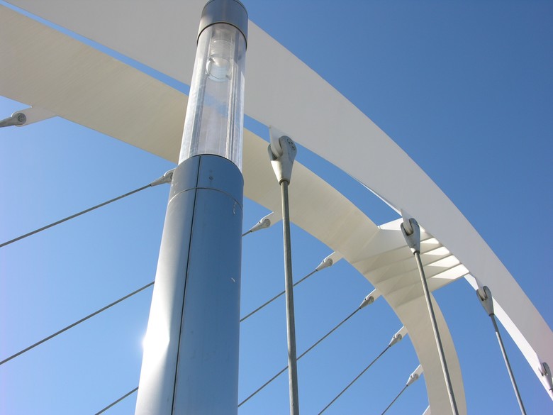 The White Horse Bridge structure consists of two tied twin arches which rise to a height of 11 m and span 30m. Steel cables attached to the arches support the composite steel and concrete deck. The arches divide the bridge into three areas, the area at the west designated part of the “paid area” of the future station, the central area forming the main pedestrian thoroughfare and the east area allowing event day visitors to access the platforms of Wembley Stadium station via composite steel/ concrete staircases. Full height stainless steel mesh cladding is provided along the edges of the bridge to meet stringent Network Rail requirements.