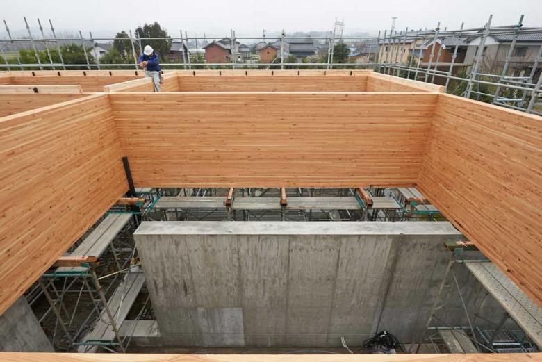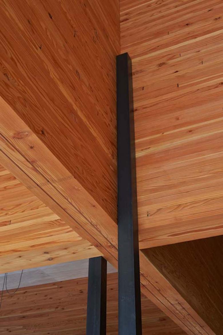 この建築の"通り芯からの解放"は、構築的には上層の木壁造を成立させる梁成2,100ミリの大断面集成材によるところが大きい。その階高を一息に確保してしまう程に巨大な縦断面が十分な曲げ強度を獲得し、さらにそれが接合部鉛直方向の十分なスタンスとなることでこの方向については完全な木造剛接合が実現するため、上下の通り芯がずれることで生じる力学上の不合理を、余裕を持って受け入れることが可能になったのである。