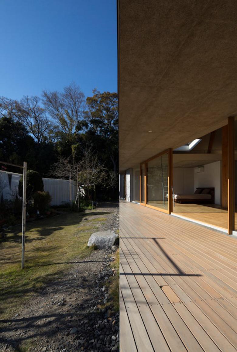 具体的には、大黒柱を有した木造の方形吊り屋根とし、これを敷地形状に合わせて東西に引き伸ばし、更に西側の森と対面する“丘のような緩勾配の屋根上デッキ”を生み出すよう、中心点を東へと偏心させた。この吊り屋根は町組の軸に揃えられたが、その下の内外境界となる外周壁は、森や太陽光に合わせ、屋根とは“9度”の角度を保って設置された。この角度によって、東側の住宅地と西側の森林公園から直接につながる陽当たりの良い“えんがわ”と、庇付きの幅広の玄関ポーチが生み出され、近隣との接続性を高めている。広々としたえんがわに接する南境界は、間口約18mの連続開口となっているが、これは3m近い片持ち状の庇と合わせて、吊り屋根構造が可能にしたものだ。