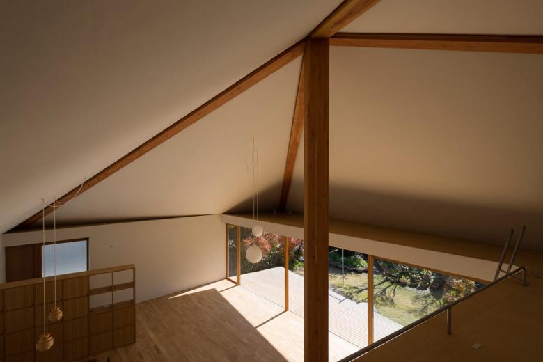 一本のセンターコラムが錘状の屋根を持ち上げる“吊り屋根”の形式であるため、外周壁は通常のように圧縮力を負担する必要がなく、基本的に構造としてフリーになる(倒れ止め程度にほんの少しの引っ張りを受け持つだけでいい)。これは、周辺環境との多様な関係に応答する“境界”を形成するに都合が良い。中心が最も高くなる空間の形状や大黒柱の存在は、暮らしに程よいまとまりや温かみを与えることだろう。