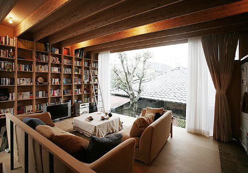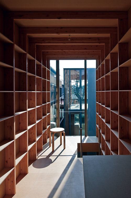 柱-梁架構を@450mmという細やかなピッチで反復しているため、主要構造材である唐松の集成材は厚さ30mmと、木製家具程度のスケールにおさまって いる。よって各部材は非常に軽く、ハンドリングにクレーン等の重機を必要としないため、主要構造体でありながらもそれらは「手の精度」によって扱われる事 が可能になる。<それより軽い他の部位は、当然手作業で製作されるので、建築全体がプロダクトの精度で実現され得ることになる。 唐松集成材は全数検査を行いその強度を確認しているが、これは木造建築でありながらもすべての部位を計算によって把握し、ムダや不合理がない状態として適 切に設定するためである。ジョイント部も、同じ目的から、発現強度の保証された金属ダボと樹脂の組み合わせによる接合金物(ホームコネクタ)を用い、建築 全体を明瞭な理解の元に置くことを意図している。各部は建築の慣習的なボキャブラリーに依らず、単純に機能的・合理的な美学に沿って決定されたのである が、その結果、その小さなスケールと併せて、建築はよりプロダクトに近づくことになった。 「小さな建築」と「大きなプロダクト」の中間に位置する住宅である。