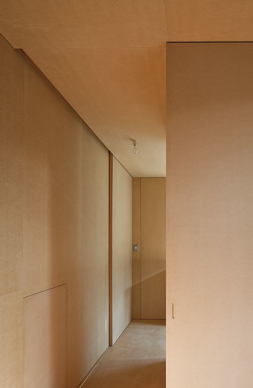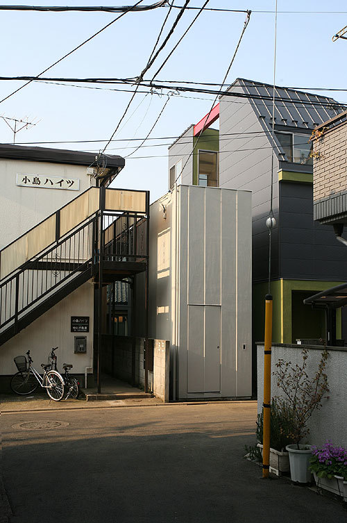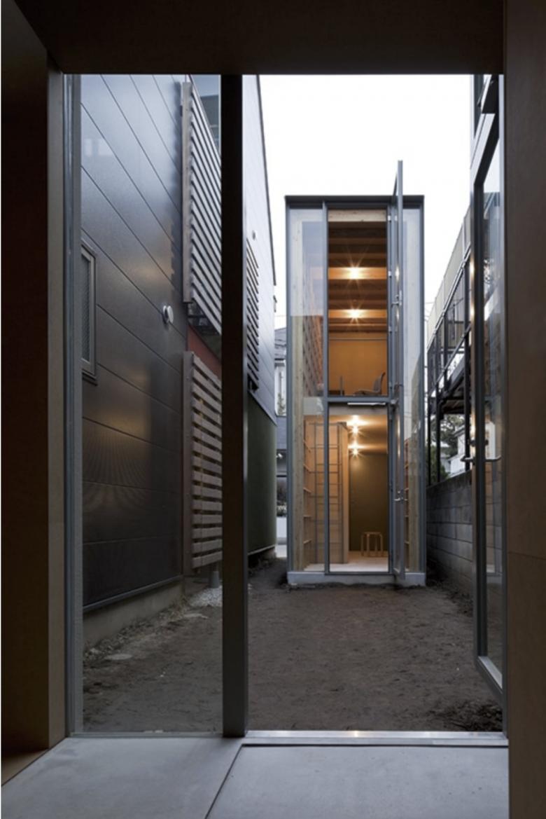 都内でも比較的細かな地割りの続く密集度の高い住宅地。それを更にもう一段分割して分譲された敷地は、当然、それなりの“小ささ”である。旗竿型という、 整形ではないこのタイプの地型では、面積に比べて周長が長くなるため、隣家や隣地の植栽などが間近に迫ってくる事になるが、地域固有のスケールの小さな肌 理からか、圧迫感というよりは、こまごまとしたモノ達が寄り添い合っているような、程よい親密さを感じさせる近接性とも受け取れた。 “小さい”と言ってしまえばそれまでだが、“近い”と言うと、それは建築的な恵みに変わる可能性が生まれてくる。この“小ささ”を“近さ”へと読み替えることで生まれる価値を求め計画を行った。 施主夫婦の職業上、また建蔽率の消化を目的として、建築は2つの小さなボリュームへと分割され、間に中庭を挟みこむ構成をとっている*1。ボリューム間の 距離が“近い”ため、庭は完全な外部というよりも、2つの室内空間をつなげる半ば内部のような延長された空間として意識される。 また、それぞれのボリュームは、厚さ30mmの唐松の集成材からなる柱-梁架構を@450mmの近接した間隔で並べることで形成されているが、この架構間 の距離の“近さ”が建築全体の“間合い”を規定している。これは建築というよりは家具やプロダクトに近い間合い*2である。使用される材も、そのような近 い間合いで人と対峙することから仕上げの具合は決定され、唐松集成材も針葉樹MDFもモルタルも、ほぼ同程度のピーチスキン状の微細な肌理へと調整され、 このスケール故に可能になるプロダクトレベルの精度によって施工された。通常の建築では意識できない程の解像度の高い世界が、建築に空間の広がりとは異な る次元の“奥行き”を与えることになった。 “小ささ”を“近さ”と読み替え、これを突き詰めることで、住宅は建築の領域を越え出てプロダクツの世界へと繋がってしまった。そういう意味では「住宅に“近い”なにものか」としてNear Houseは存在し初めているのかもしれない。 (*1.建築可能な敷地部分は“旗竿”の“旗”部分と、パーキングとするために多少巾が広くとられた“竿のグリップ”にあたる部分だけであった) (*2.例えば一般的なカラーボックスは巾450mmで材厚は15mmである。Near Houseはこれを並べたものに等しい)