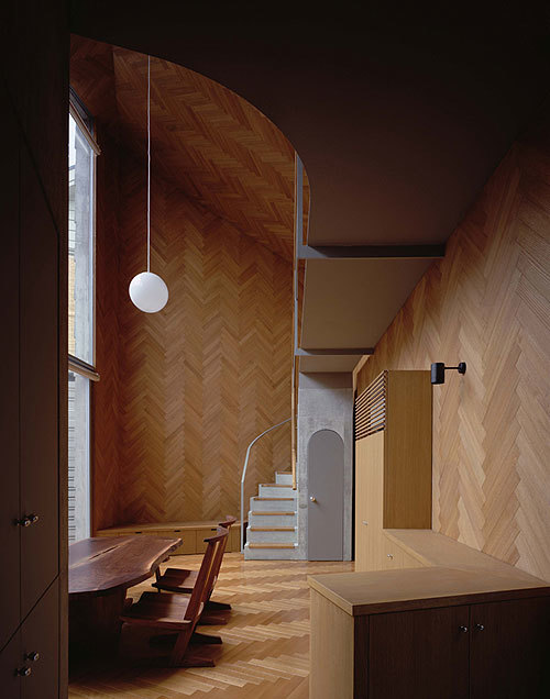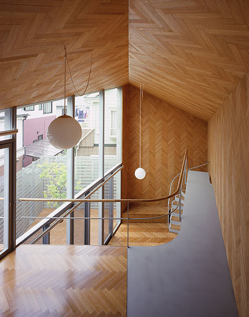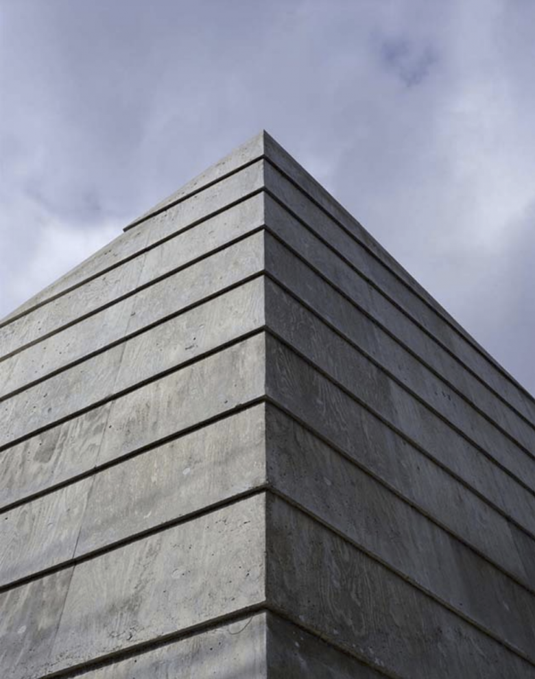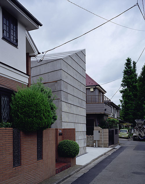 気候の中の建築 敷地は、温暖湿潤気候帯から熱帯雨林気候帯へと、近い将来、移ろうとしている関東平野中央やや西寄り、東京都内の低層高密な住宅地内にある。 求めたのは「住宅」というよりも「居住」を誘発する永続的な「地形」。 そして、この地形を予定調和に陥らないよう発見的に「住居」へと整えていく、そのような意識で計画を行った。 高い居住のポテンシャルを有した地形を求める、と言うからには、建築は抽象的な形態論に留まらない。 地形とは岩石や土壌という具体的な物質が、地域毎に異なる気象の中で長い年月の間応答してきた結果であるからである。 素材と気象の最適な応答関係を見出し建築化する。 これは現代建築の文脈が無視してきた気象や素材、経年変化の諸問題をデザインファクタへと再び取り込み、建築的恵みへと転換しようとする試みでもある。 「永続的に存在する地形」を実現する構造・素材の探求から始まった。 実際の地形のように構造と仕上げが一致する既存技術としては「RC打放」があるが「永続性」という点では問題がある。 雨水による壁表面からのアルカリ分の融出はその寿命を極端に短くしているし、化粧合板型枠による平滑な表面は竣工時は良いが、風雨に晒されることで数年後には悲しい歳の取り方をしてしまう。 そこで新たに型枠構法を開発し、約@500mmでh=18mmの水切りを持つ彫の深いRC打放を実現する事で、アルカリ分の融出や汚垂の問題を解決した。 更に型枠は化粧合板の代わりに針葉樹合板を用い、木目を壁面に転写する事で肌理を粗く仕上げ、ジーンズのヨレのように経年変化を美的な要素へと転換した。 上記の構法で作られるRCの量塊を敷地を斜めにスラッシュするように配置する 。これによって発生する2つの外部空間は、道に面した北側をパーキングに使う「外庭」、南側を母屋と隣家に守られた風の穏やかな日だまりの「内庭」へと性格づけられる。 「内庭」はプライバシーもセキュリティーも確保されるので、建築は南側の明るい庭と「大きな空」へと開き、これを取り込む事ができる。 また立体的にも矩形からずれたジオメトリーは既成の空間型に収まらず、各所に「闇」が生み出される事と合わせて、空間に奥行きと流動性をもたらしている。 内部には、大きな空の下の暮らしがある。 外部は、晴天時には外壁の凹凸が強い陰影を生み出し、雲天時には湿度をたたえて黒々とした岩山のようになる。 そして、雨の日には水滴のレースをまとう。 「空模様」が変化するのに合わせて、建築もその様相を変えていく。 気候と呼応する現代建築が生まれたのである。