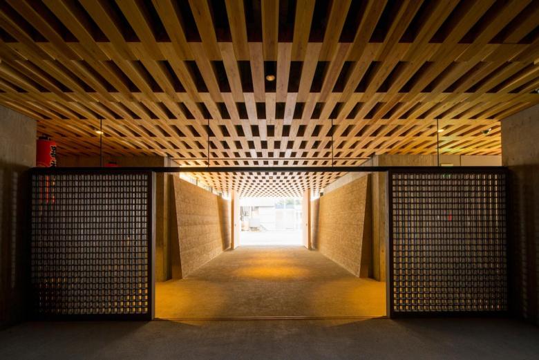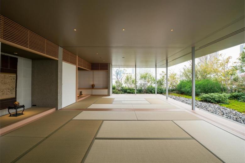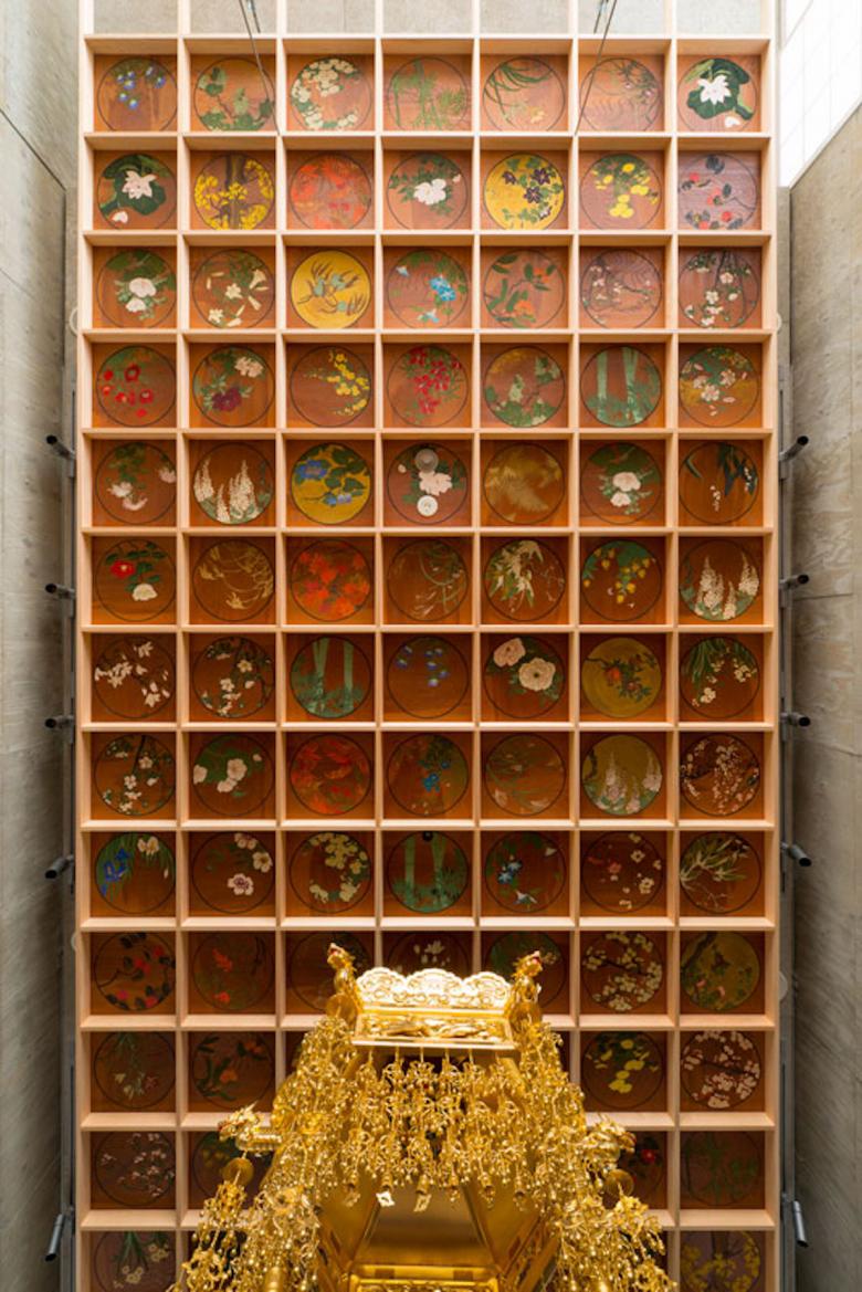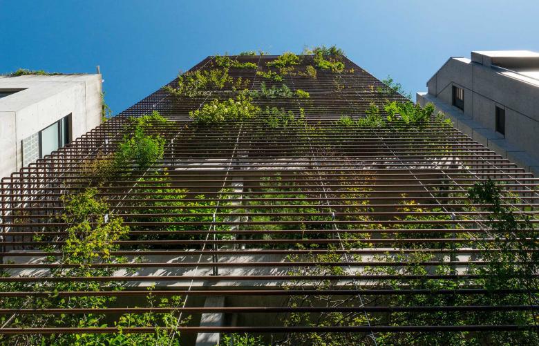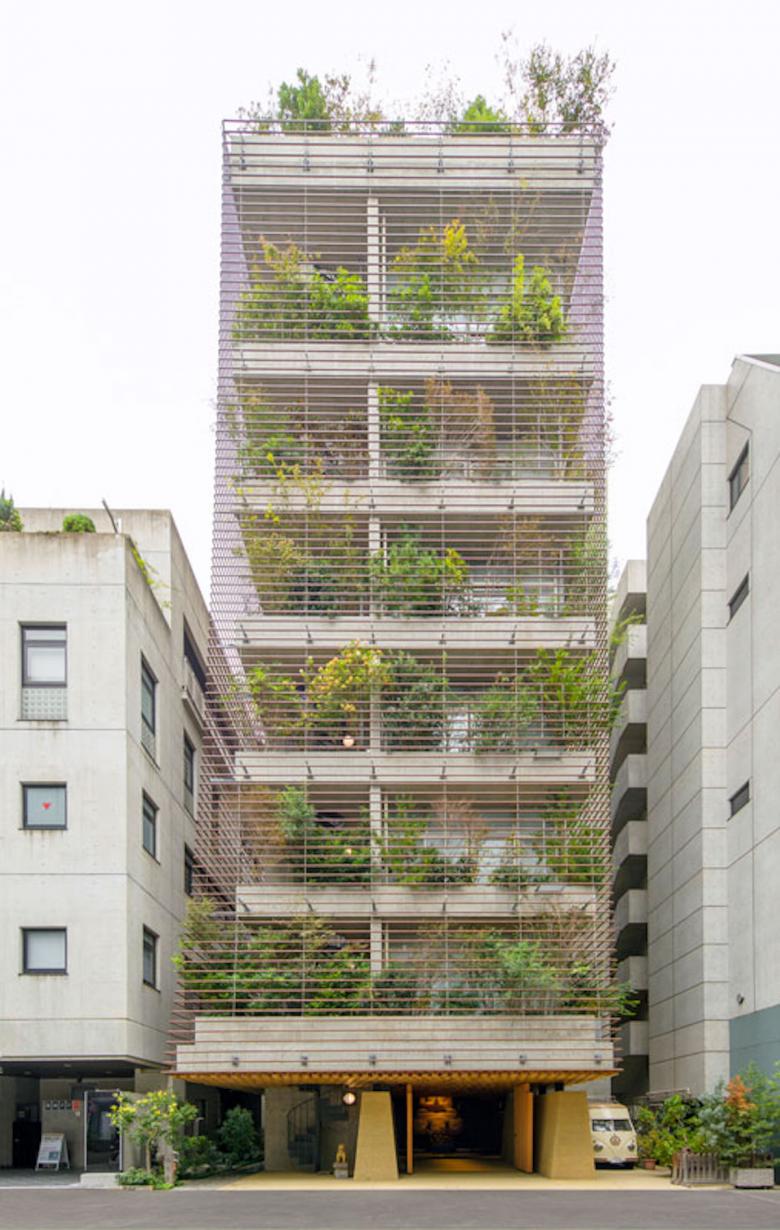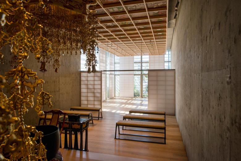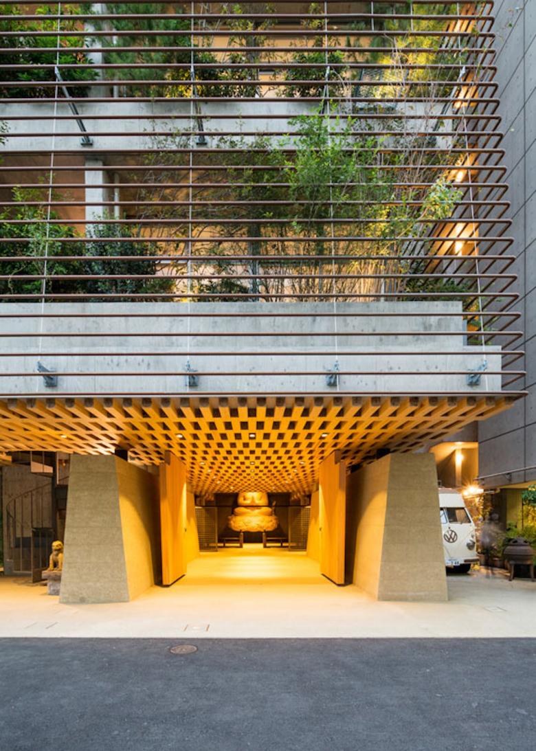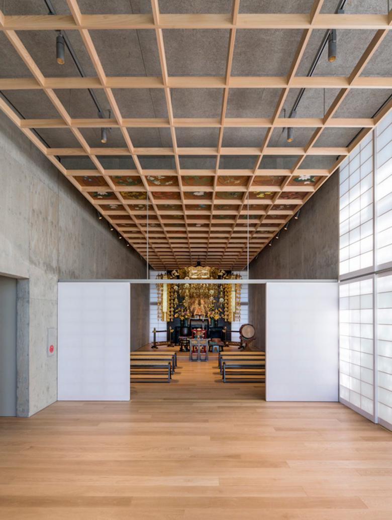 建築は一層を地域開放の大仏殿、2〜6層を参拝施設、7階は法要を行う本堂とし、それらのRC構造体の上部に、軽やかな鉄骨造の書院を乗せた構成である。2〜7層の各スラブのテラス部に土入を施し、そこに主として関東の潜在植生の木々を植樹した後、それをカバーするようにして、銅管でできた簾状のスキンを7階パラペットから吊り下ろした。重力なりに懸垂曲線を描く銅の簾は、離れて通りから見れば視線を透過して、背後の樹々だけが緑の山塊となって都市に現れ、逆に近づいて見上げれば、伝統的な社寺建築の銅板葺きの反り屋根のようにイメージを転じ、新たに「山」に植えられた桜と共に、かつての本堂の記憶と接続している。更に、正面から山門を抜け、次第に高く反り上がっていく垂木と空間という構成もまた、以前の本堂から引き継いだものだ。