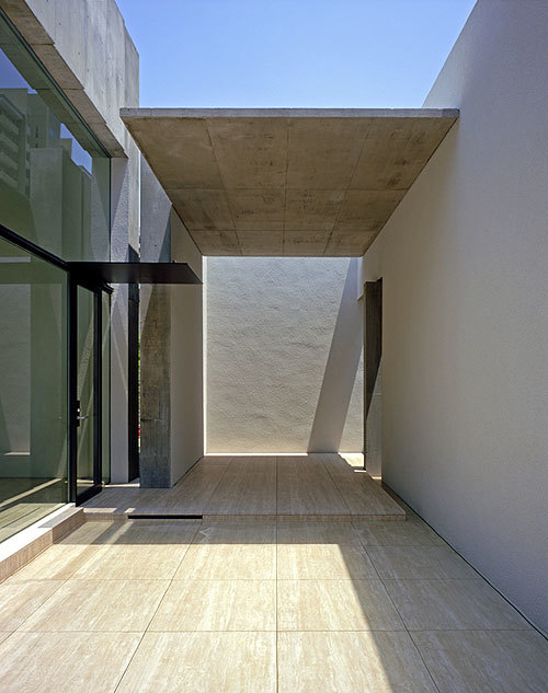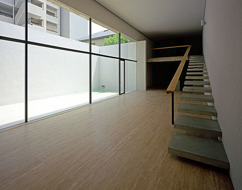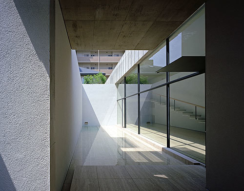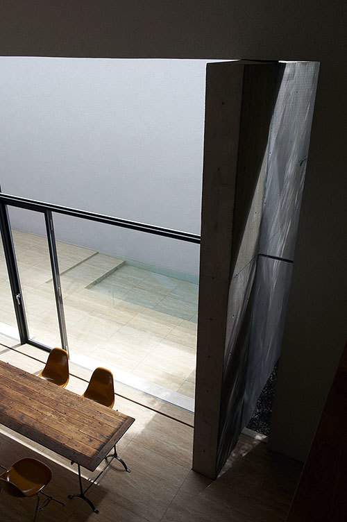 この操作によって生まれた3つの南北に長い空隙は、内面を白左官で仕上げ区画されることで空間化され、真中の空間を薄く水を張った光庭、その両側の空間を 居室とした。しかし、構成上、これらの空間は完結せず、その端部において「ほつれ」ている。この「ほつれ」によって、3つの実空間に跨がるようにこれらを リエゾンする2つの虚空間が発生し、この知覚上の広がりが敷地の特性上生まれてしまう実空間の幅の狭さを解決している。また、境界を跨ぎながら重複しあう 空間は谷筋を分け入るような、シークエンスの多様な展開を実現することになった。