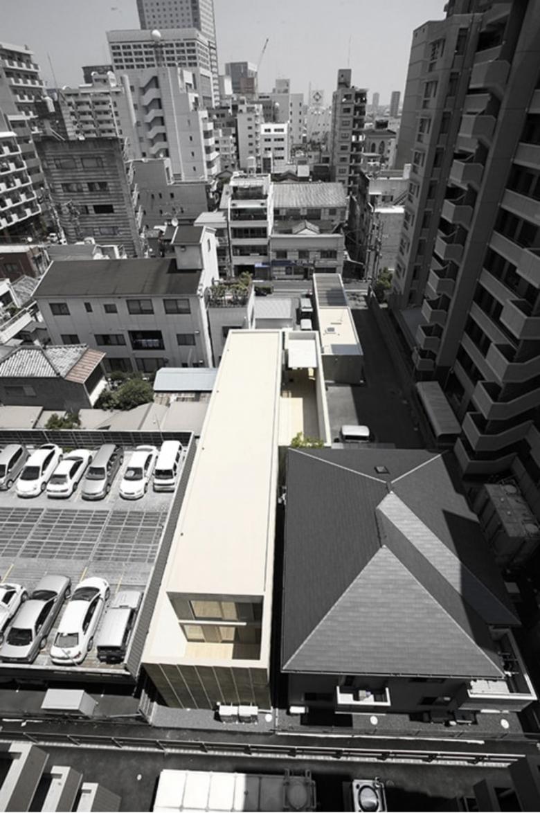 途中二度程クランクした、南北に50m、幅4〜5m程の細長い敷地。県庁所在地でもある地方都市の中心部に位置していて、周囲は高容積な防火地域であることから、中高層の鉄筋コンクリート造の建築物がひしめき合っている。背の高いマンションに挟まれた敷地はまるで深山の谷筋のようであった。