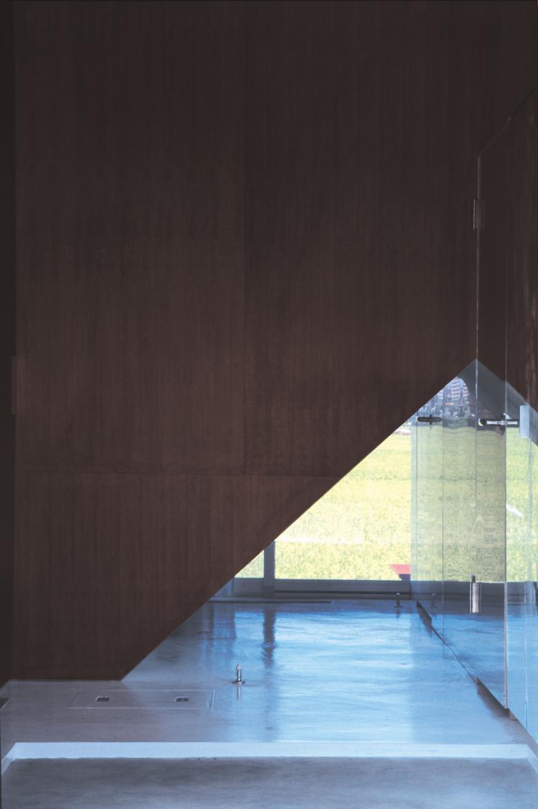 3つのボックスのうち、西のボックスは、シナ合板張りの抑えたつくりで、窓は使い勝手とのバランスで決め、風景の見え方は素直である。中央のボックスは、光の散乱する溶融亜鉛メッキ鋼板の空間を、目透し張りの板でくるんだ。小屋の切断面が額縁となり、景色が、絵のように鮮やかに切り取られる。東のボックスは、鏡や全艶の塗料で仕上げた壁と天井に、ツキ板やじゅうたんといった保守的な材料が混ざる。仕上面への風景の映り込みで、虚像実像の境界は不分明になり、外部が室内に浸透し、風景とインテリアが一体になる。
