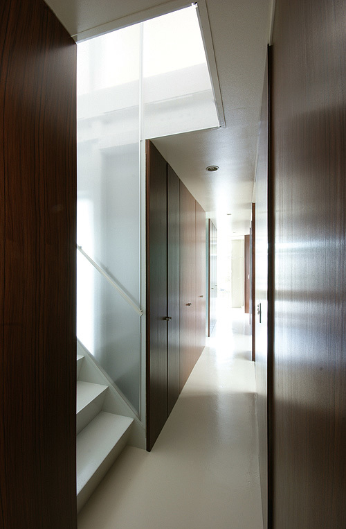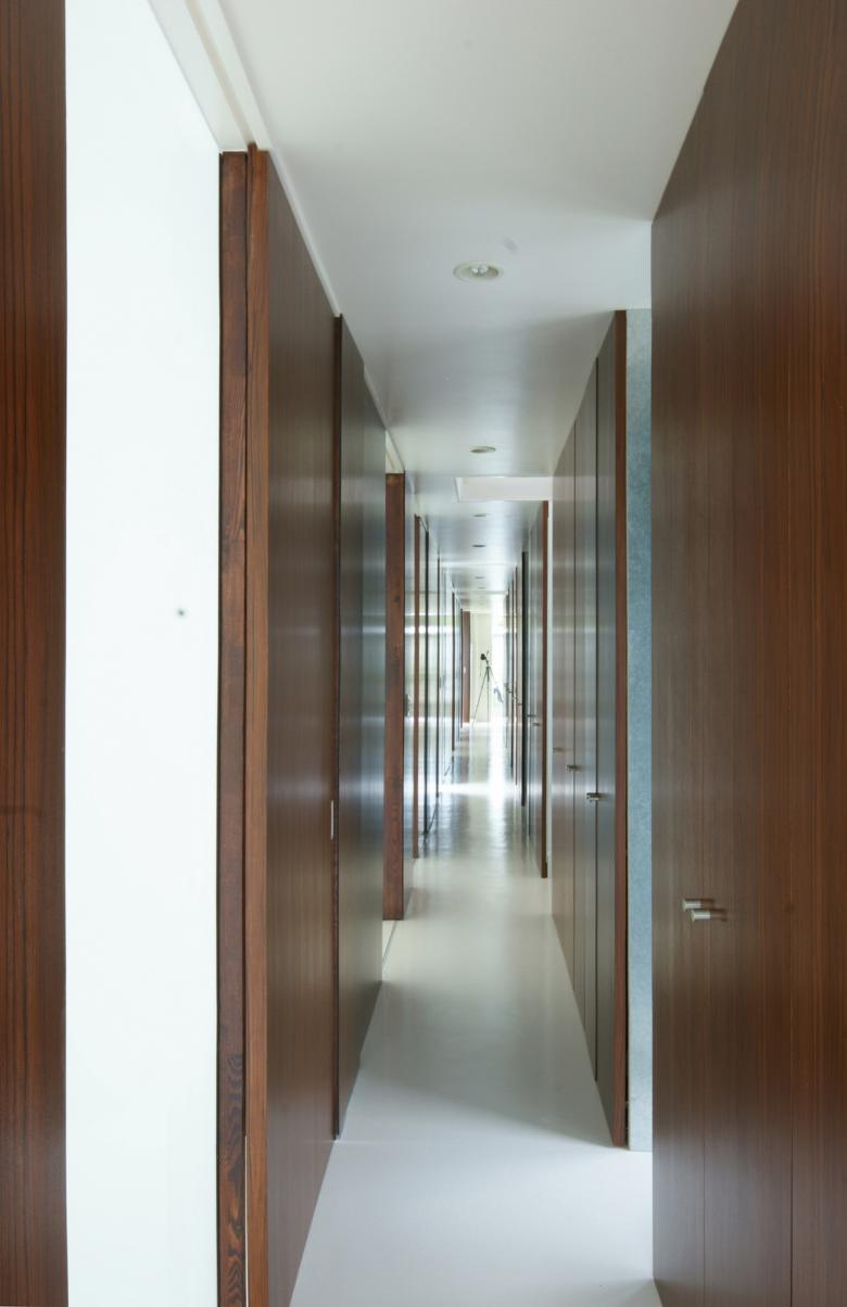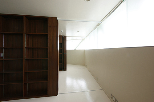 1階の長い廊下の両端には、鏡が張られている。鏡の効果で、廊下の奥行は引き伸ばされ、実際以上に、距離が長く演出される。