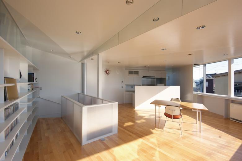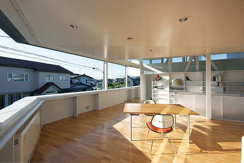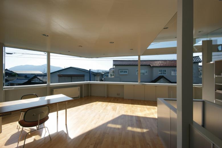 将来の変化も想定すれば、直交面の開口部が提供するのは、「山の見える風景」ではなく、周囲が変化しようとも、大きく変わることなく存在し続ける、「山の暗示」である。そして、ここはまた、その2つの山系が交差する場となる。