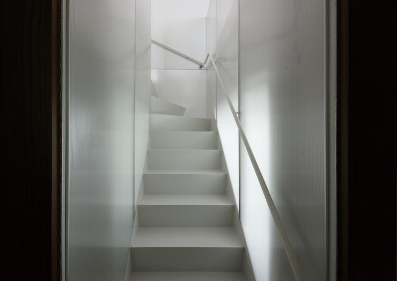 窓からの高照度の光と、濃い色の壁との輝度差により、照度は明るいにもかかわらず、壁の暗さが際立っている。どれも、2階との対比をつくるためだった。