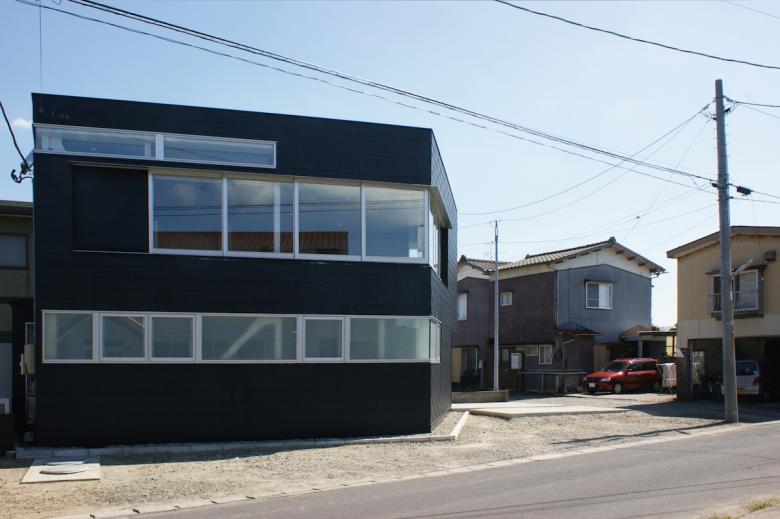 2つの直交面は、鈍角でぶつかる。平面や直角の窓とは違い、環境の中に、室内が、やわらかく入り込んで行く効果を生み出し、街に対しては、突き出す形となり、小さな灯台のようなランドマークとなった。