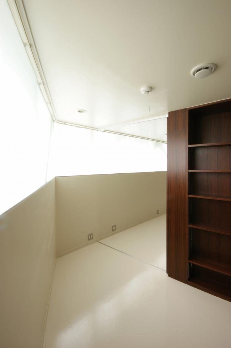 平面的には、壁や家具を放射状に配置し、断面的には、奥から窓に向かって、天井に上向き勾配を付けている。そうすることで、1階とは対照的に、逆パースペクティブが、奥行を縮め、山を近づけて行く。