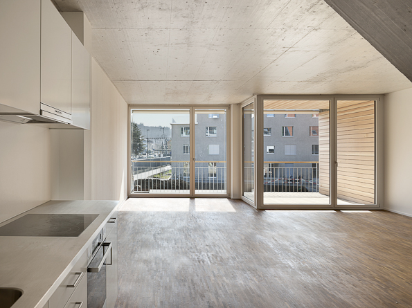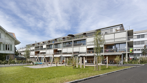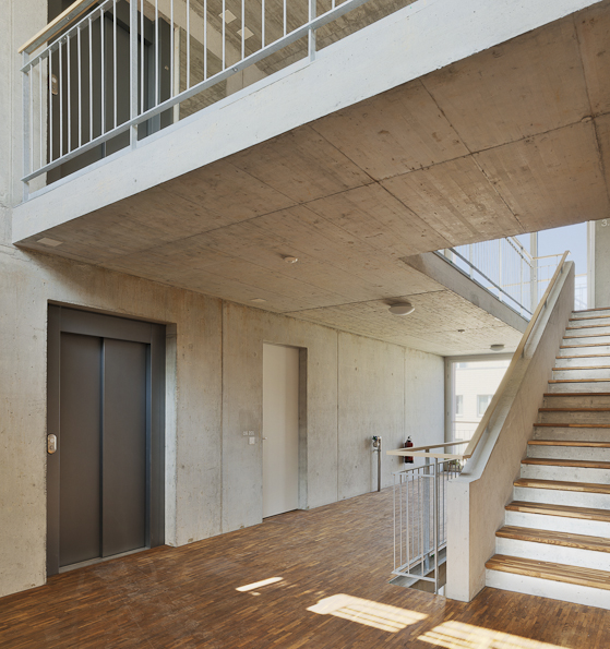 Das Gebäude wird zur Hauptsache durch eine «rue interieur» im 2. OG erschlossen. Die Typologie mit grosser vertikaler Flexibilität bietet eine gute Voraussetzung für die Realisierung verschiedenster Wohnungsgrössen und Wohnformen vom Einpersonen-Haushalt bis zur grossen Wohngemeinschaft. Dank dieser Planungsflexibilität kann eine weitgehende Mieterpartizipation für die Erstvermietung gut umgesetzt werden.